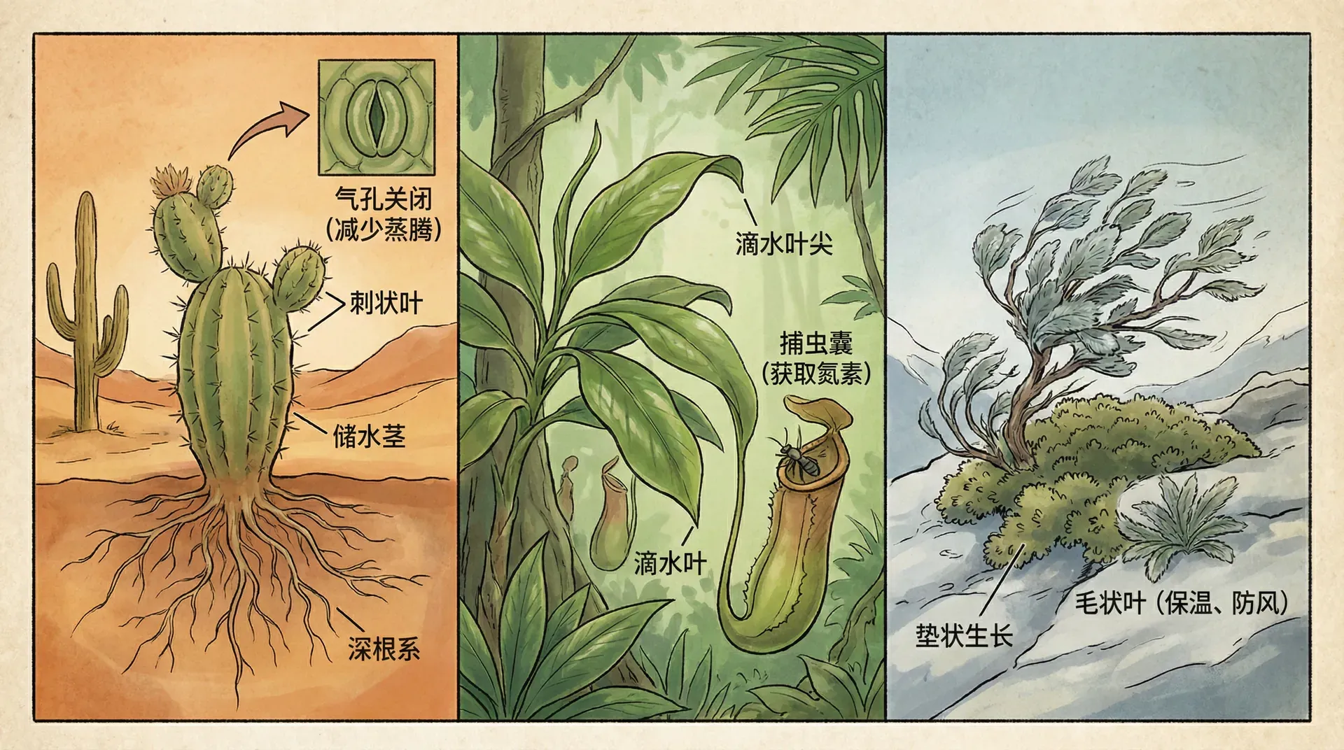 不同植物采用的策略会有所差异,这取决于它们的生长习性和所处的环境。下表总结了几种常见植物的资源获取特点:
