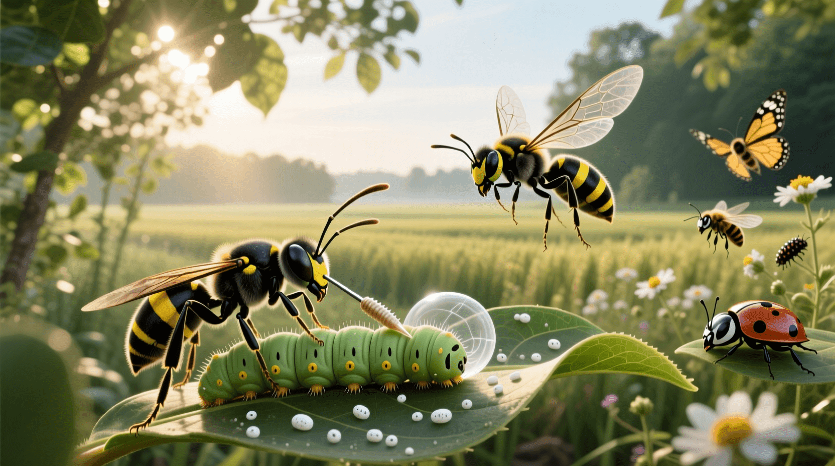 一只寄生蜂妈妈,她在一只蚜虫体内产下10个卵。这些卵孵化后在蚜虫体内发育,成年后它们会在蚜虫体内或附近交配,然后离开寻找新的宿主。这种情况下,兄弟姐妹之间会竞争交配机会。