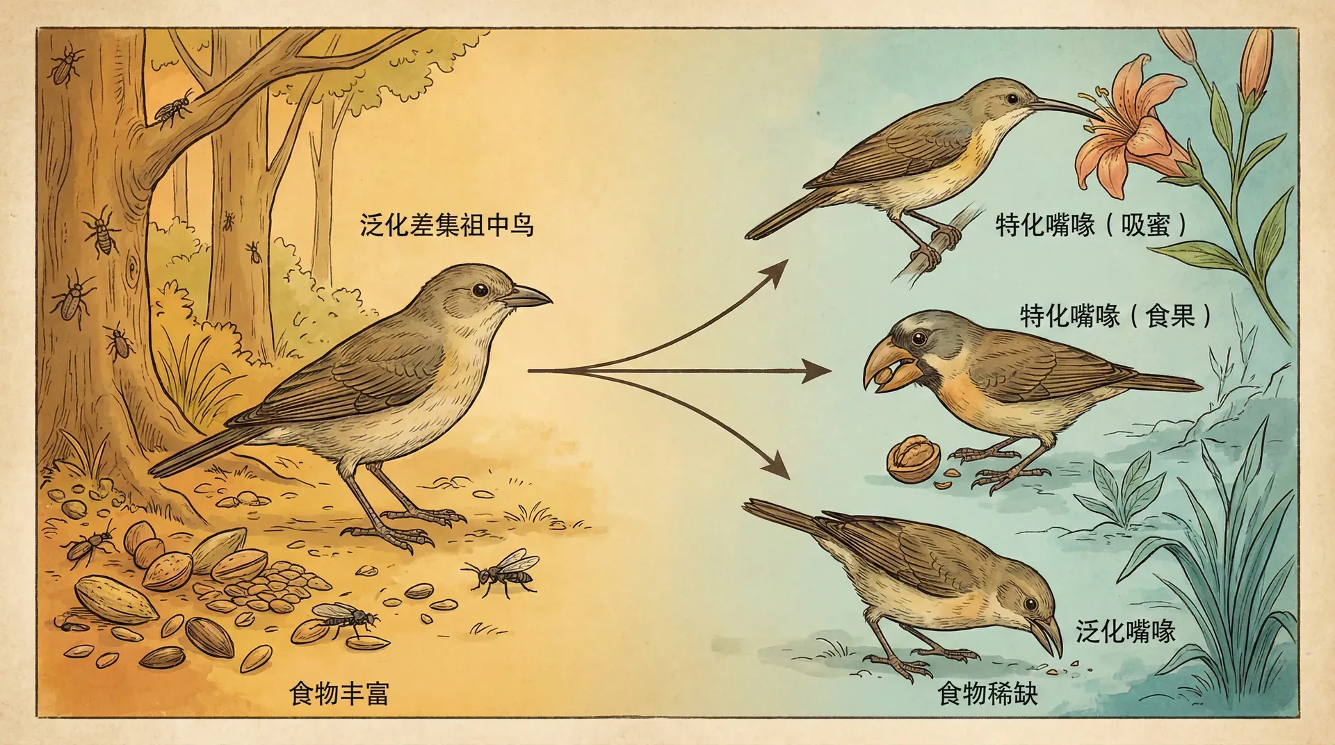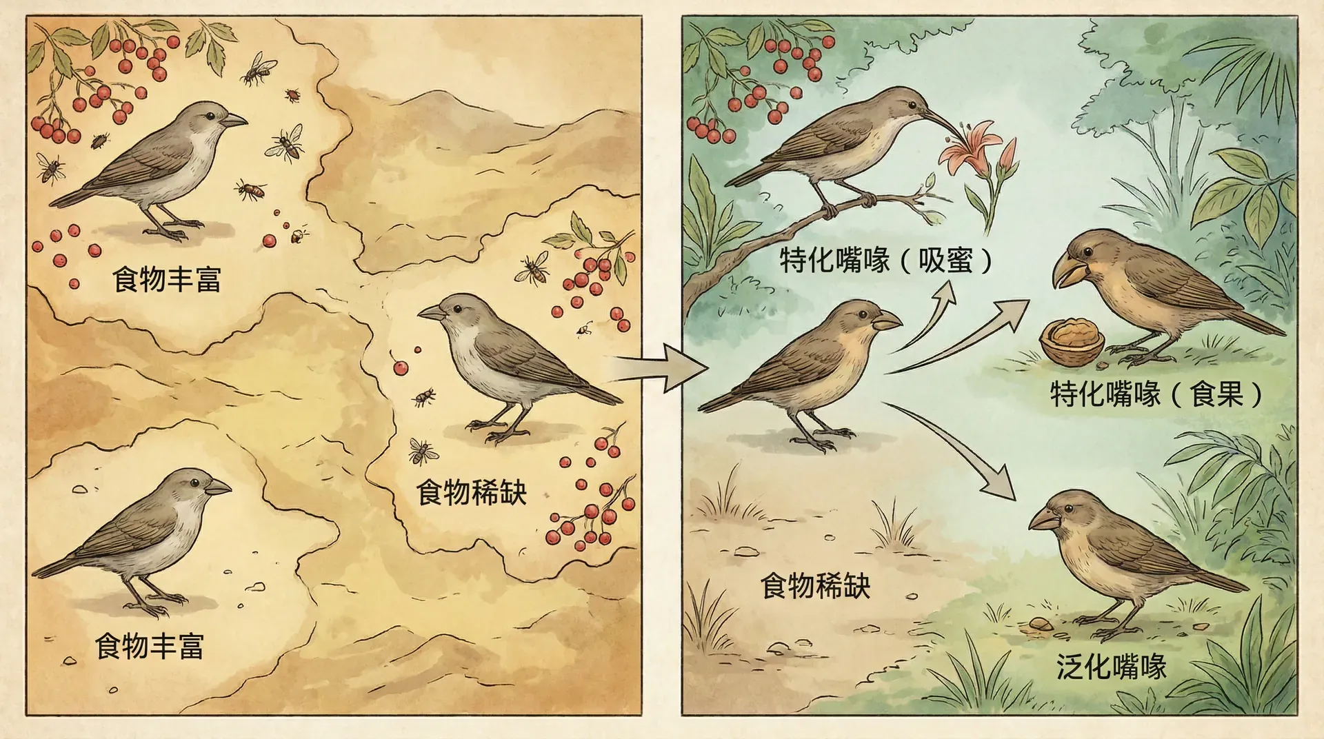 在海拔3000-5000米的高原地带,生活着多种不同的“高原雀”。在只有一种雀鸟独自占据某个山谷时,它们表现出中等的体型和喙型,能兼顾摄食硬壳的植物种子和捕猎昆虫,食谱比较均衡且泛化。然而,一旦两种具有重叠食性的雀鸟在同一区域共存,情况就会发生戏剧性的改变——一方的喙会逐渐变得又粗又短,有利于啄开坚硬的种子外壳,另一方的喙则演化得又细又长,更适合捕食缝隙中的昆虫。这种同域分化的现象,在高原的不同山谷被反复观测到,是自然选择和生态位分化联合作用下的典型标本。