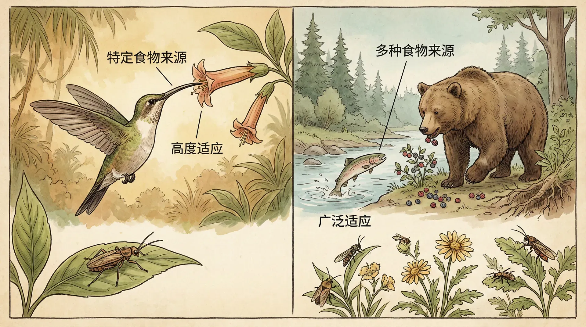 适应性权衡的核心就是“鱼与熊掌不可兼得”。当环境差异很大、资源分布集中时,专化往往是更好的策略;而当环境变化频繁、资源分散时,泛化可能更有优势。