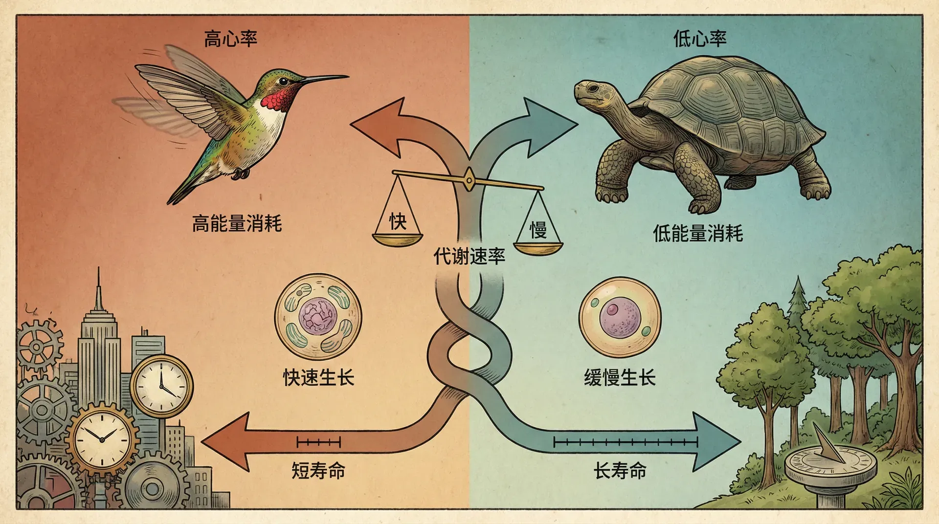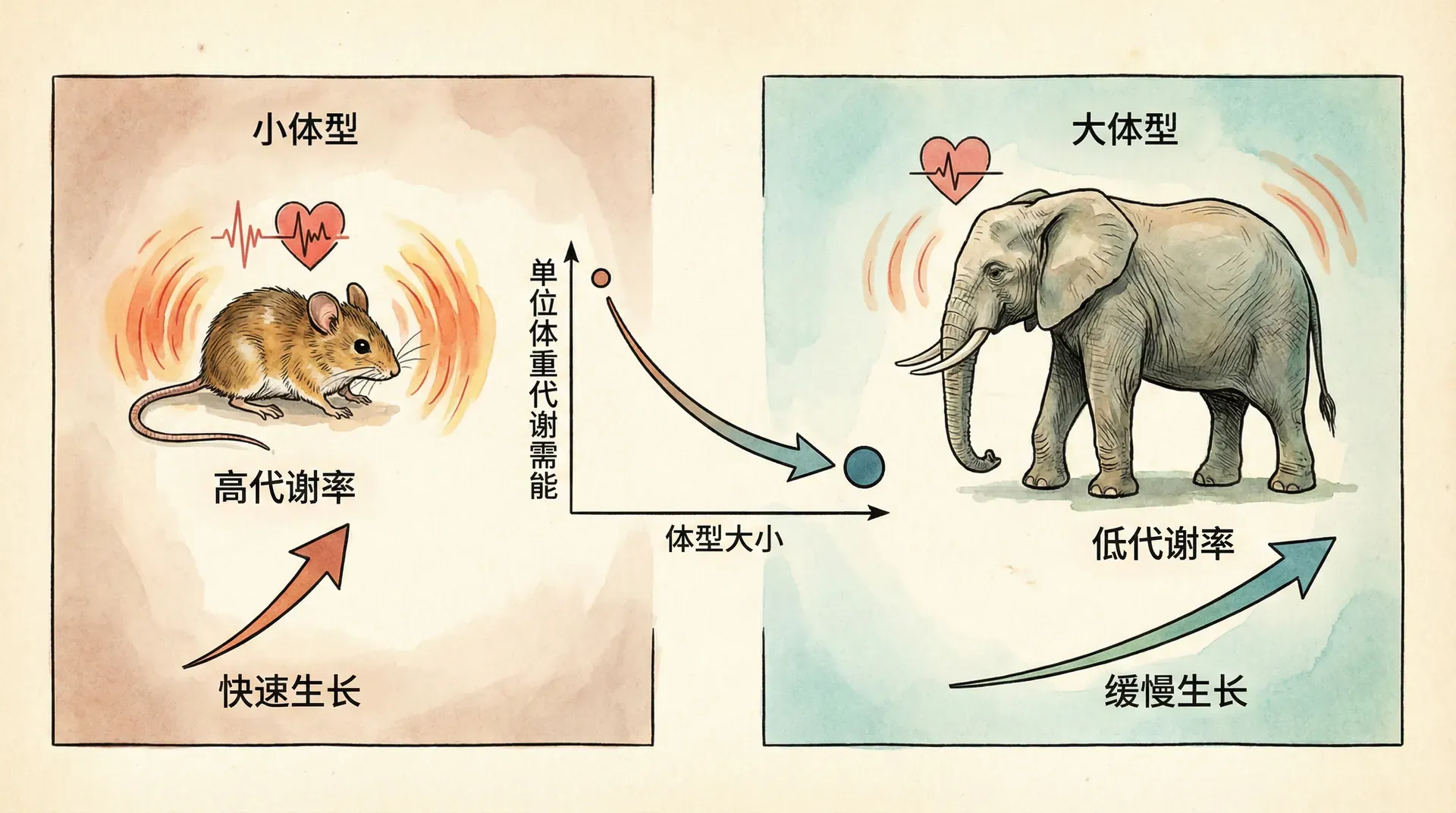 代谢效率的差异深刻影响了生物的生存策略。小型动物高代谢率迫使它们快速生活、频繁进食;大型动物低代谢率使它们能承受更长的食物短缺期,采取更从容的生活节奏。