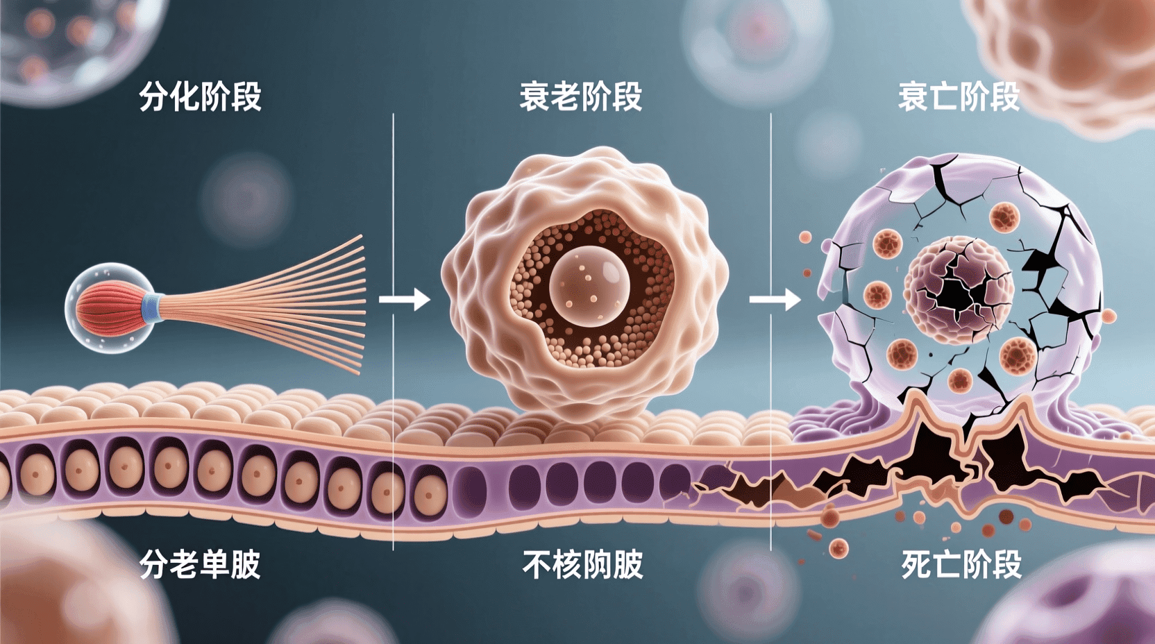 此外,细胞也有自己的“生命历程”,并非永葆青春。从细胞诞生的那一刻起,它们就会随着发育和环境的变化逐渐经历成熟、衰老甚至死亡。细胞衰老表现为分裂能力下降、新陈代谢减缓、功能减退等;而细胞死亡则是一种无法逆转的生命终结过程,既可能是一个自发的自然现象,也可能是为了维持机体正常功能而主动启动的程序(如细胞凋亡)。