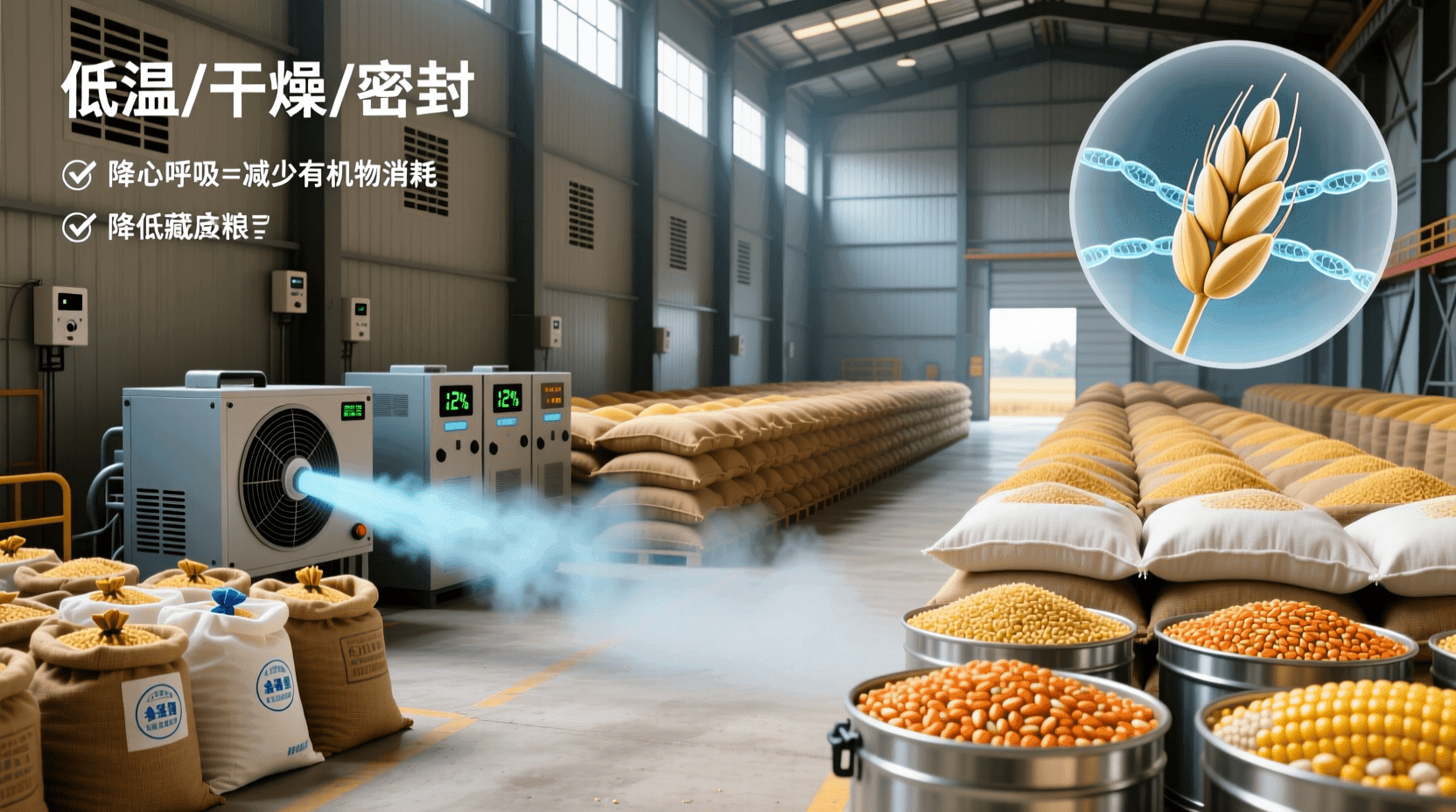 低温储藏:降低温度可以降低酶的活性,使细胞呼吸速率减慢,减少有机物的分解,延长储藏时间。温度过低虽然可能导致某些粮食品质下降,但在适宜的低温范围内(如10-15℃)效果最佳。