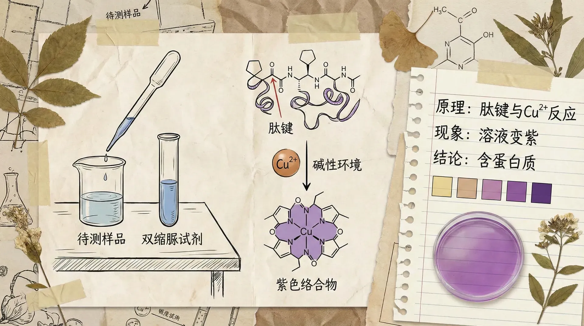 实验时,先向待测液中加入2mL A液,摇匀,使溶液呈碱性。然后加入3-4滴B液,摇匀。如果待测液中含有蛋白质,溶液会呈现紫色。这是因为蛋白质分子中的肽键与双缩脲试剂中的Cu²⁺在碱性条件下发生反应,生成紫色络合物。
