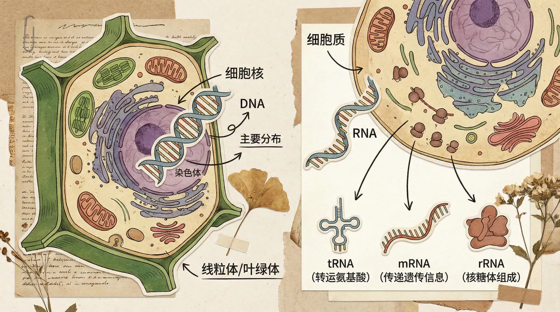 RNA主要存在于细胞质中,在细胞核中也有分布。RNA有多种类型,包括信使RNA(mRNA)、转运RNA(tRNA)和核糖体RNA(rRNA)等,它们在蛋白质合成过程中发挥着不同的作用。