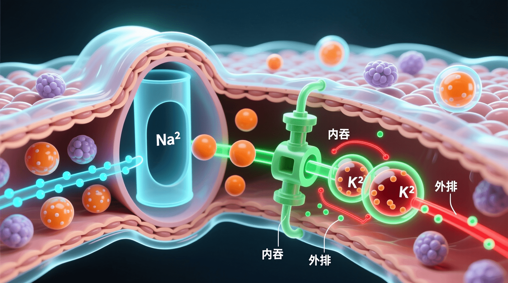 主动运输对于细胞维持正常的生命活动至关重要。例如,人体细胞内钾离子(K⁺)的浓度远高于细胞外液,而钠离子(Na⁺)的浓度则相反,细胞外液中的钠离子浓度远高于细胞内。为了维持这种浓度差,细胞膜上的钠钾泵不断地将钾离子从细胞外液泵入细胞内,同时将钠离子从细胞内泵出细胞外。这个过程需要消耗大量的ATP,据估计,人体细胞产生的ATP约有三分之一用于维持钠钾泵的运转。
