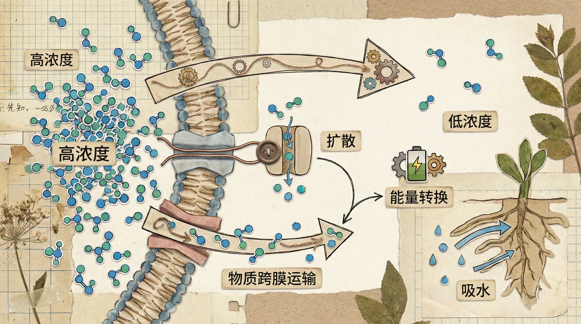 当我们将新鲜的黄瓜切片放入盐水中腌制时,不久黄瓜片就会变软,并渗出水分。这是因为黄瓜细胞内的水分通过细胞膜流向了外界的盐水溶液。相反,如果将腌制过的黄瓜片放入清水中,黄瓜片又会逐渐变得饱满起来。这些日常生活中常见的现象,实际上都涉及物质跨膜运输的基本原理。