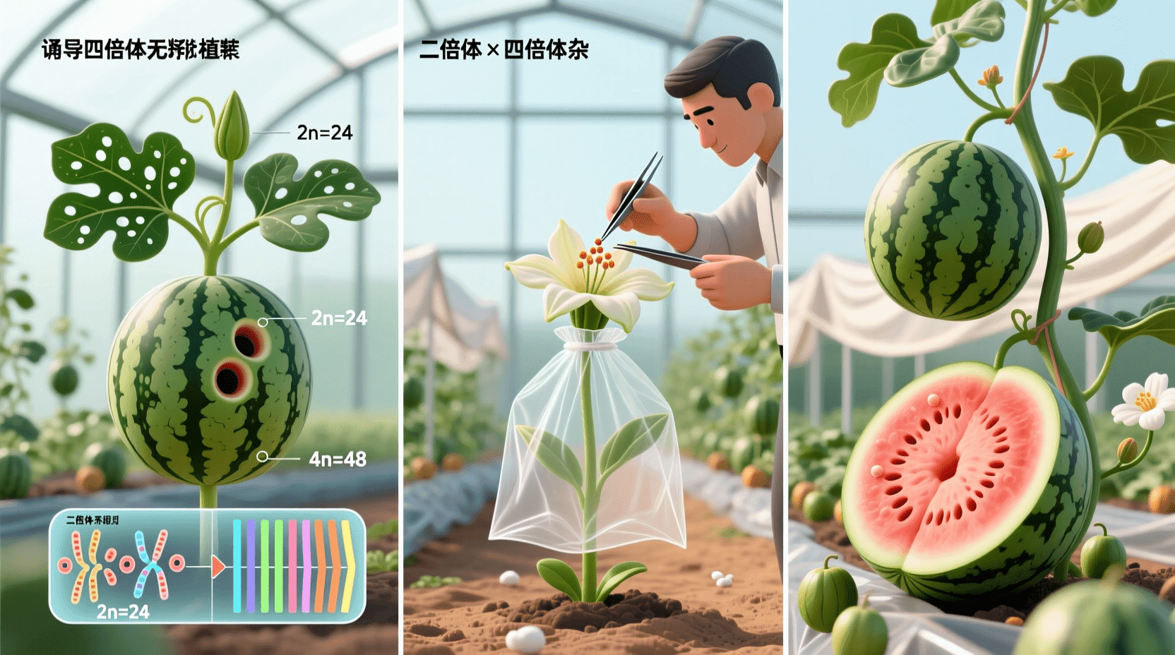我国科学家在多倍体育种方面取得了显著成就。例如,三倍体无籽西瓜的培育就是利用染色体数目变异的典型案例。普通西瓜是二倍体,用秋水仙素处理二倍体西瓜的幼苗,可以得到四倍体西瓜。四倍体西瓜与二倍体西瓜杂交,产生的种子发育成三倍体西瓜植株。三倍体西瓜在减数分裂时,由于含有三个染色体组,同源染色体无法正常配对,不能产生正常的配子,因此不能形成种子,成为无籽西瓜。