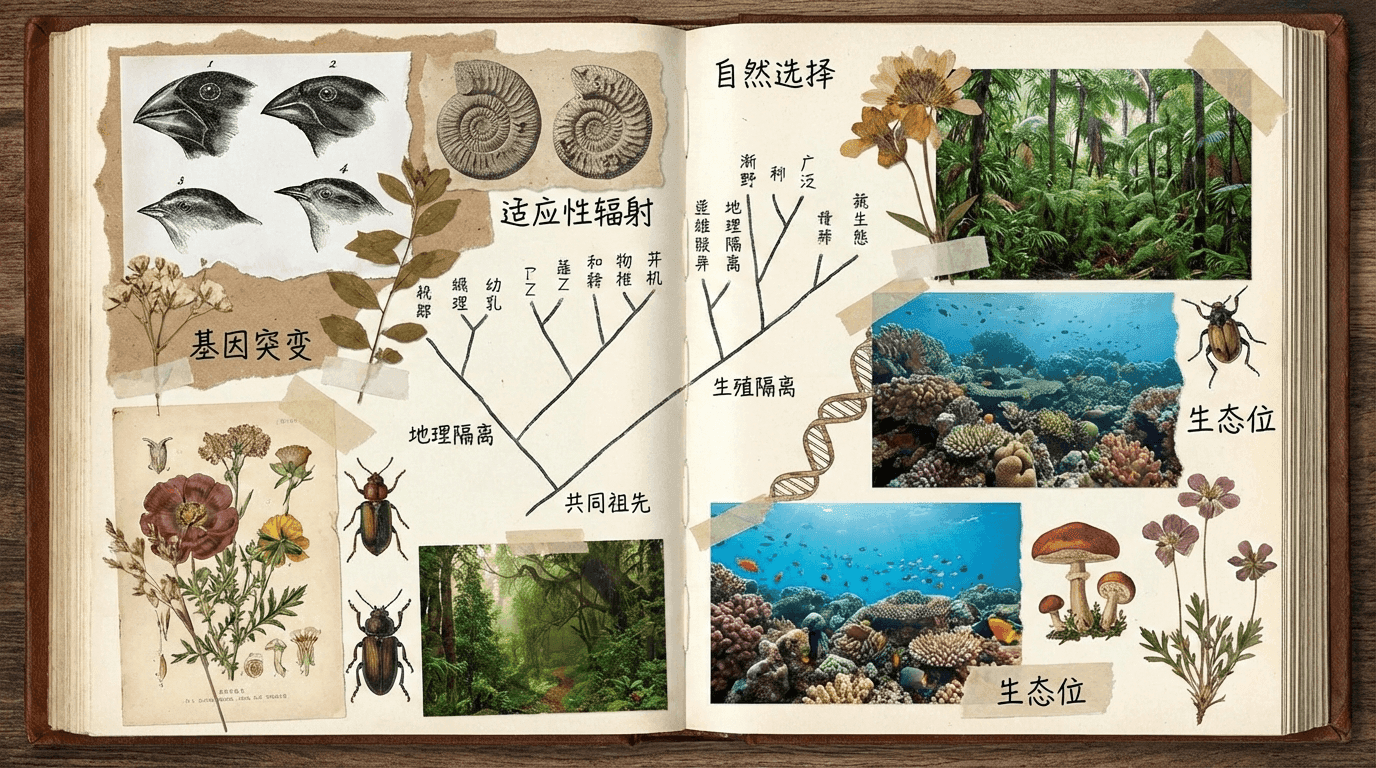 同地物种形成(Sympatric Speciation)无需地理阻隔,是在同一区域内部,个体因生态位分化、行为隔离等因素,逐渐演化为新物种。常见机制包括: