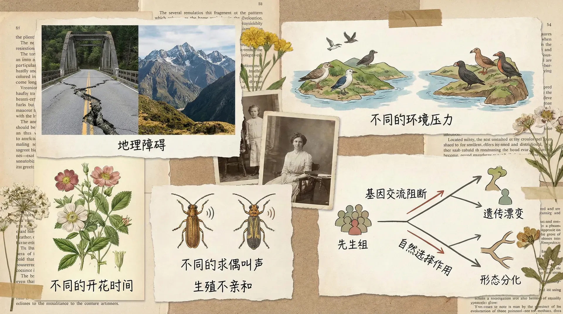 需要注意的是,从地理隔离到生殖隔离的形成通常需要很长的时间,可能需要几千年、几万年甚至更长的时间。在这个过程中,如果地理障碍消失得太早,不同群体重新接触并进行基因交流,那么物种形成的过程就会中断,群体重新融合为一个物种。