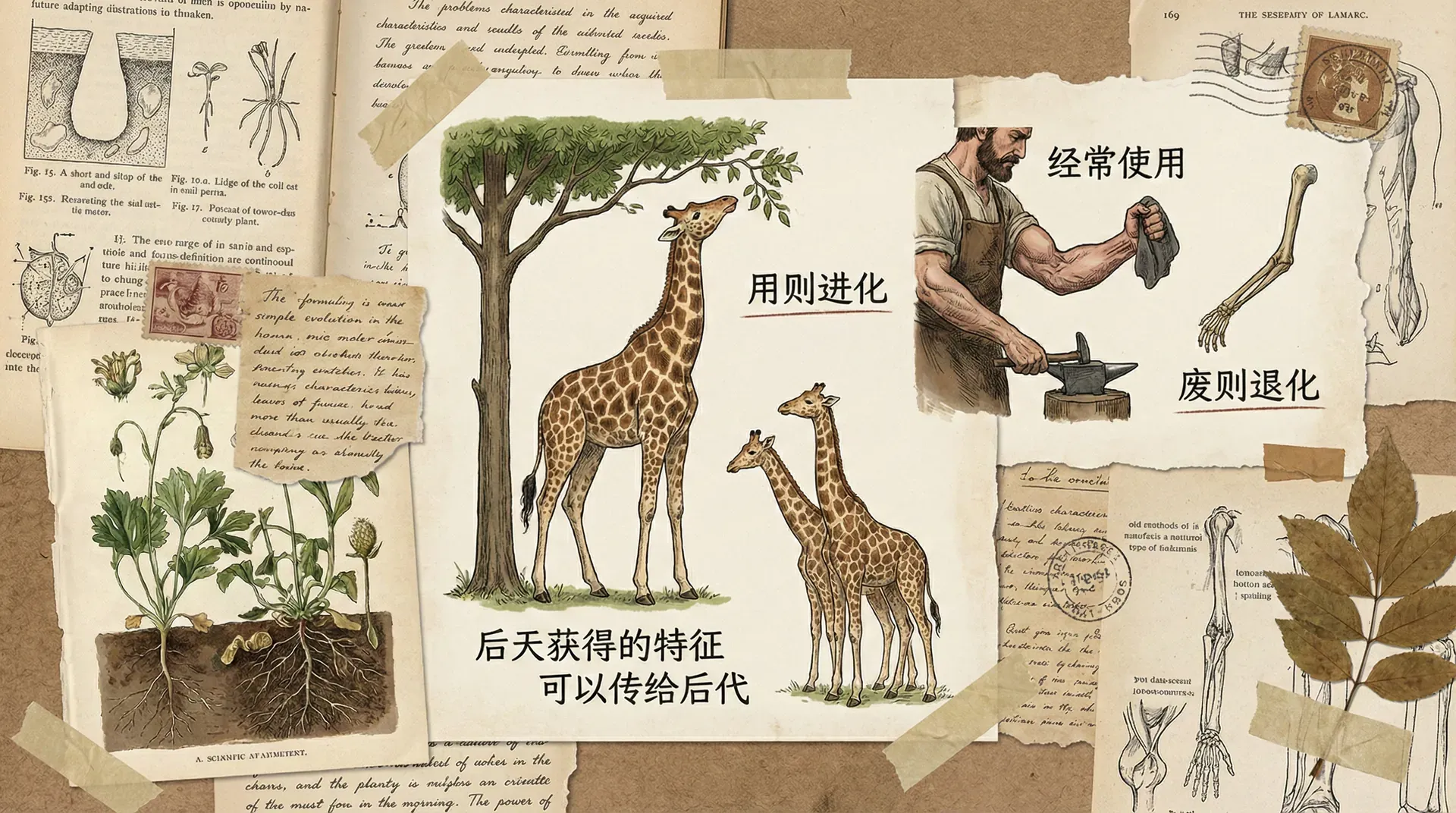 他认为,长颈鹿的祖先原本颈部并不长,但由于生活在稀树草原上,需要经常伸长颈部去吃高处树叶上的叶子。在个体的一生中,由于不断地伸长颈部,颈部就变得越来越长。这种在个体生活中获得的长颈特征会遗传给后代,一代一代累积下来,最终形成了现在长颈鹿的长颈特征。