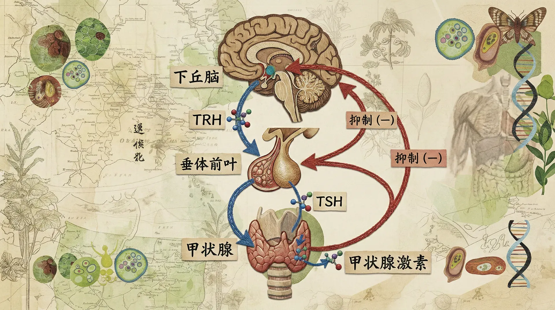 调节过程从下丘脑开始。下丘脑中的神经细胞感受到体内甲状腺激素浓度的变化,当甲状腺激素浓度降低时,下丘脑分泌促甲状腺激素释放激素(TRH)。TRH通过垂体门脉系统运输到垂体前叶,刺激垂体前叶分泌促甲状腺激素(TSH)。TSH经血液循环到达甲状腺,促进甲状腺合成和分泌甲状腺激素。