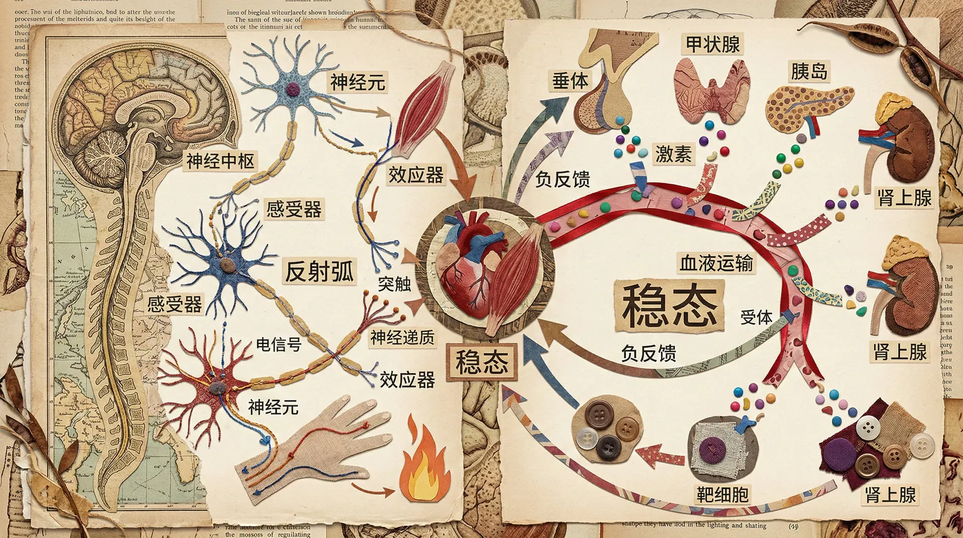 神经调节和体液调节不是孤立的,而是相互联系、相互协调的统一整体。神经系统居于主导地位,反应迅速、准确;内分泌系统是重要的补充,作用缓慢、持久、广泛。两者共同构成完善的调节网络,保证机体内环境的稳态。