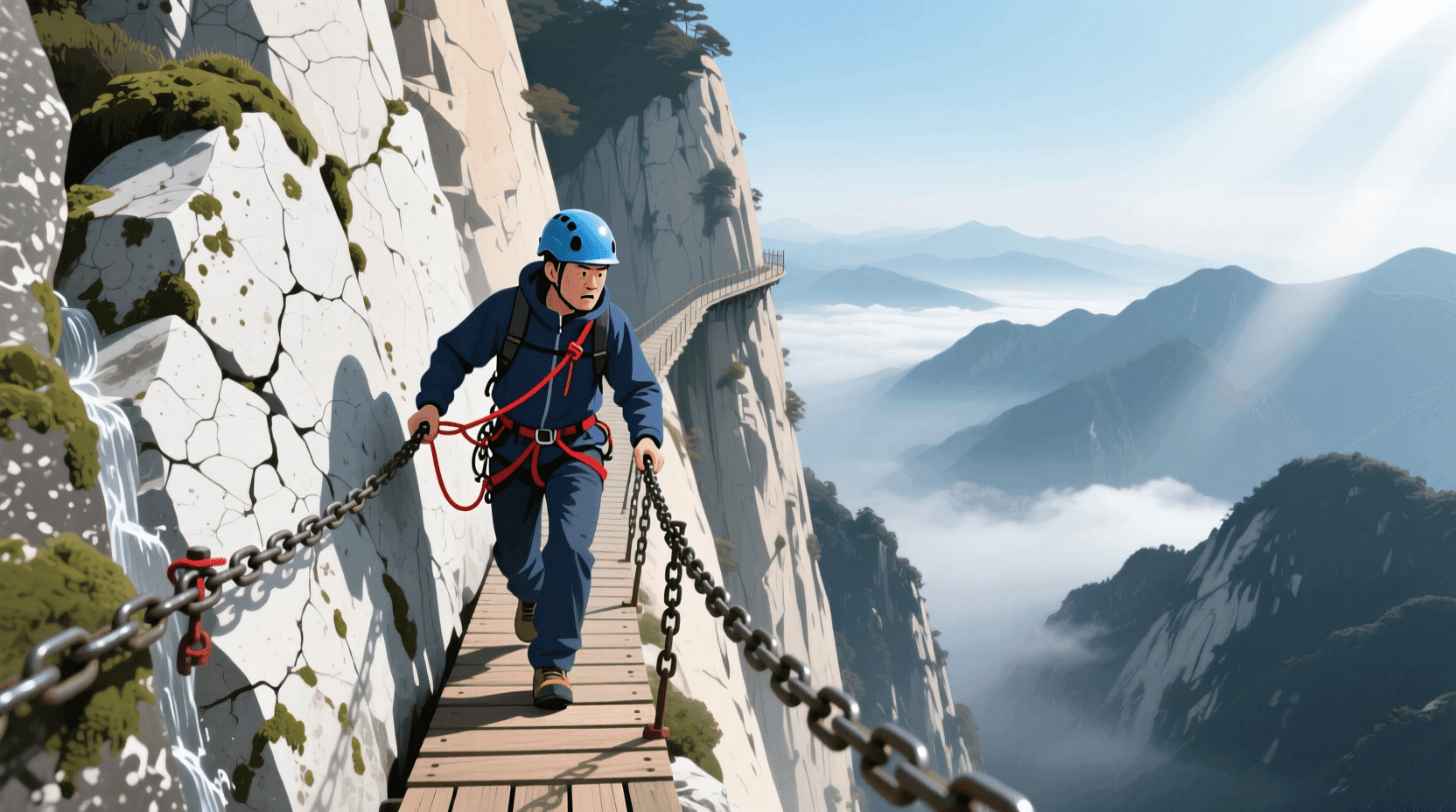 在秦岭山脉的山麓地带有华山,这座山以其险峻的“长空栈道”而闻名,游客需要系着安全绳在悬崖峭壁上行走。这条栈道经过一个急转弯后就是180英尺的垂直悬崖(现在可以通过绳降通过)。山区救援队发现,在这里发生意外的人员中,年轻人占绝大多数,他们大多是在夜色中探索时走得太远而出了意外。这些受伤者总是青少年。
