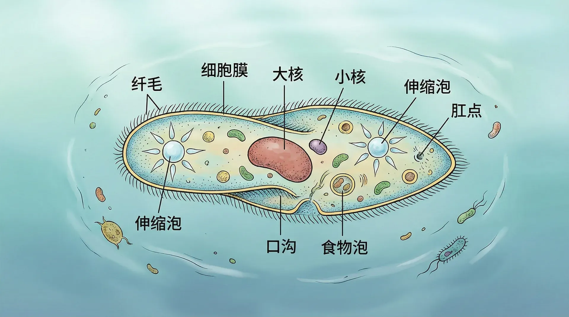 草履虫是一种常见的单细胞动物,因为身体形状像倒置的草鞋而得名。草履虫生活在有机质丰富的淡水中,如池塘、水沟等。虽然只有一个细胞,但草履虫能够独立完成运动、摄食、消化、呼吸、排泄、繁殖等全部生命活动。