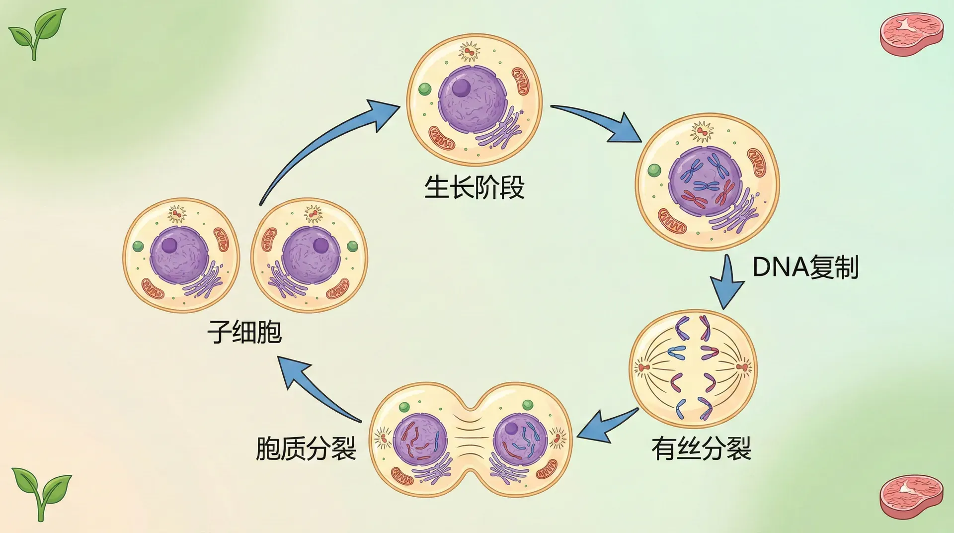 细胞分裂是生物生长发育的基础。通过细胞分裂,一个细胞分裂成两个细胞,两个细胞再分裂成四个细胞,细胞数量不断增加,生物体才能不断生长。