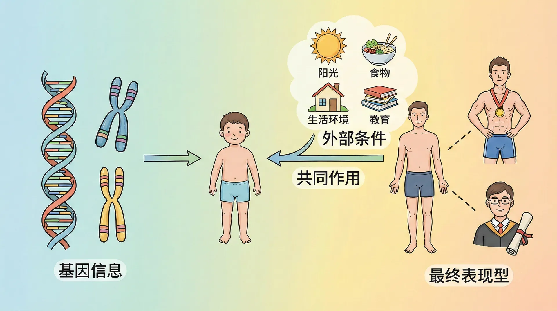 性状的形成受基因和环境的双重调控。许多性状(如身高、体重、智力等)既受基因型决定,同时又深受养育、营养、教育等环境因素影响。例如:身高很大程度由遗传决定,但营养不良或疾病可以抑制其生长潜力。