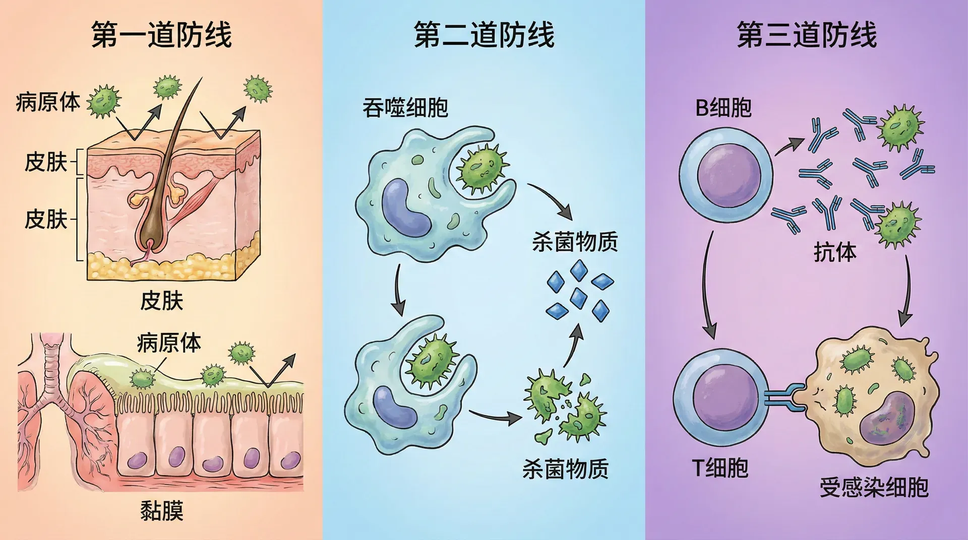人体的三道防线相互配合,构成了完整的免疫系统。前两道防线是先天就有的,是人体的基本防御;第三道防线是后天获得的,是人体的高级防御。三道防线协同作用,使人体能够抵御绝大多数病原体的侵袭。