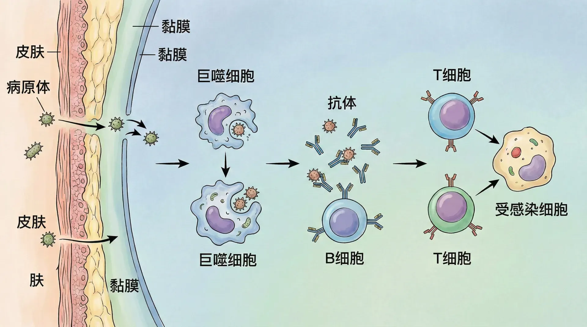 第二道防线同样是非特异性免疫,对多种病原体都有作用。但它的作用也是有限的。如果病原体数量太多、毒力太强,或者人体抵抗力下降,第二道防线可能无法完全消灭病原体,这时就需要第三道防线发挥作用。