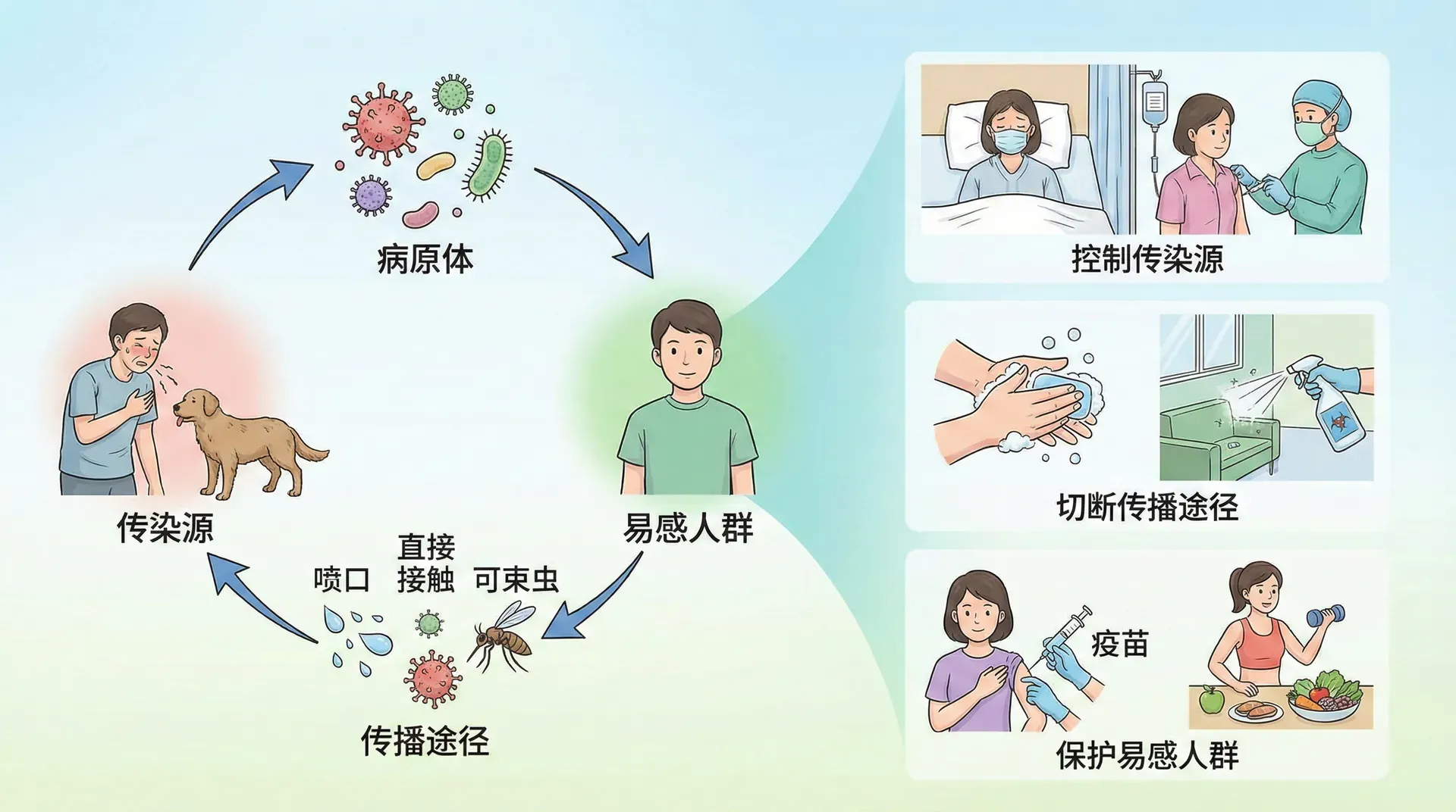 知识点:理解传染病的流行环节,掌握常见预防措施,明白疫苗和群体免疫的重要性,以及综合防控的必要性。