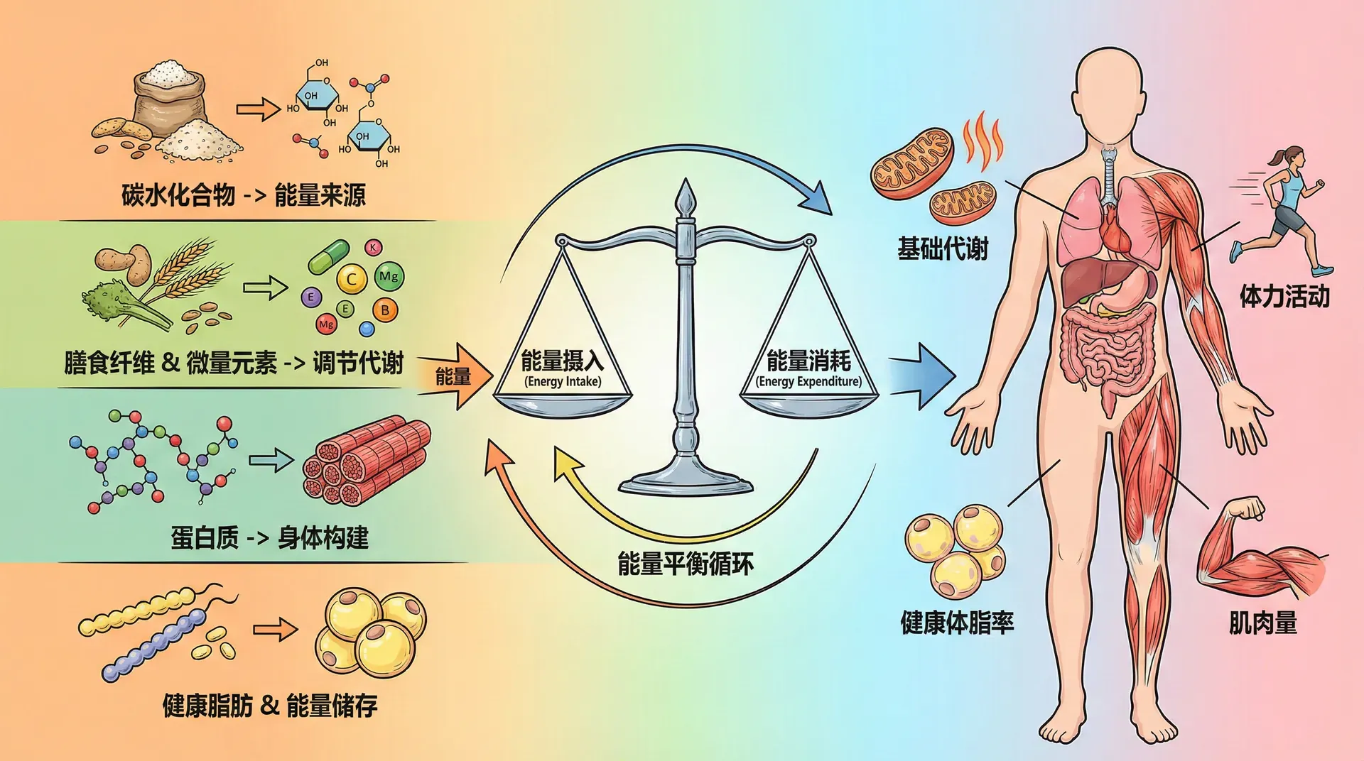 合理营养的核心是平衡膳食,即各种营养素搭配合理、比例适当。中国营养学会发布的《中国居民膳食指南》提出平衡膳食宝塔,形象地说明了各类食物的推荐摄入量。宝塔底层是谷类,建议每天摄入250-400克,提供主要能量。第二层是蔬菜和水果,建议每天蔬菜300-500克,水果200-350克,提供维生素、矿物质和膳食纤维。第三层是鱼禽肉蛋类,每天120-200克,提供优质蛋白。第四层是奶类和豆类,每天奶类300克、豆类25-35克。塔尖是油和盐,应该少吃,每天烹调油25-30克,盐不超过6克。