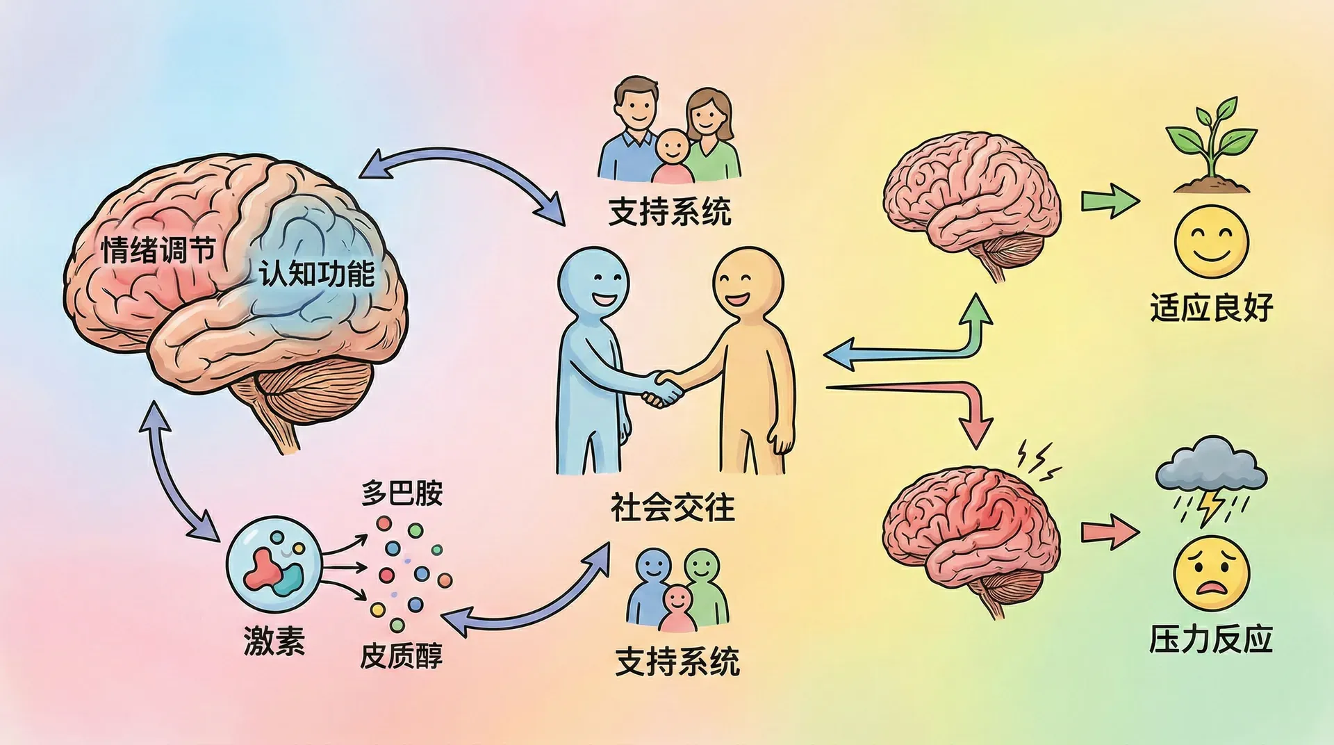 健康不仅指身体健康,还包括心理健康。世界卫生组织明确:心理健康指个体在认知、情绪、行为等方面处于良好状态,能够适应环境、实现潜能,并具备应对日常压力的能力。青少年时期身体和心理快速发展,面临学业、同伴、家庭、社会等多重压力,是心理问题高发阶段。