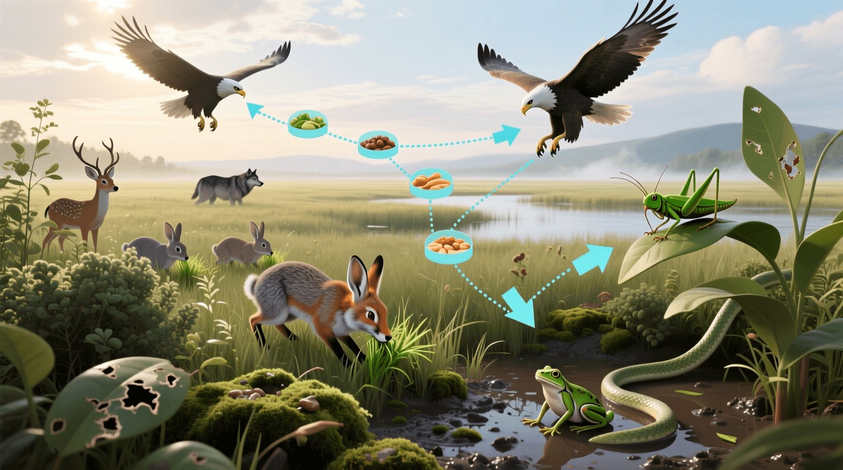 自然界中的营养关系远比单一的食物链复杂。一种生物通常会吃多种食物,同时也可能被多种生物捕食,这样多条食物链相互交错,形成食物网。食物网越复杂,生态系统越稳定。因为当某一条食物链中的某个环节出现问题时,生物还可以通过其他途径获得食物或被利用。