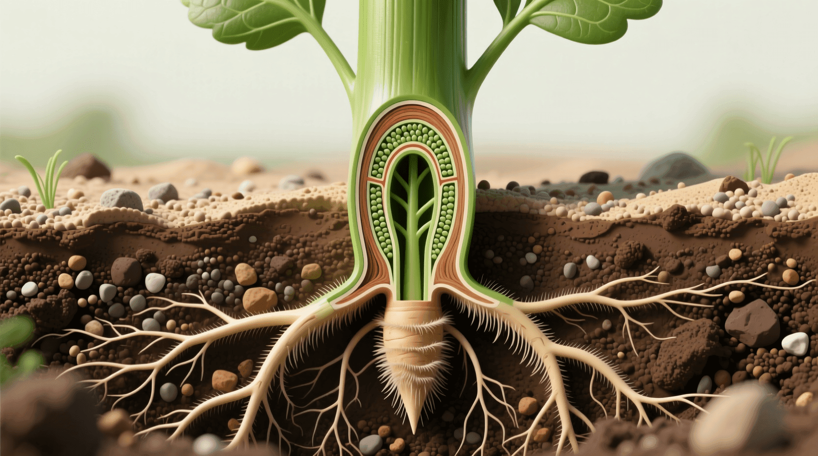 植物的根系有两种基本类型:直根系和须根系。直根系有一条明显的主根,主根上生出许多侧根,像一棵倒置的树。双子叶植物如菜豆、向日葵、萝卜等都具有直根系。须根系没有明显的主根,由茎的基部生出许多粗细相近的根,形似胡须。单子叶植物如小麦、水稻、玉米等都具有须根系。