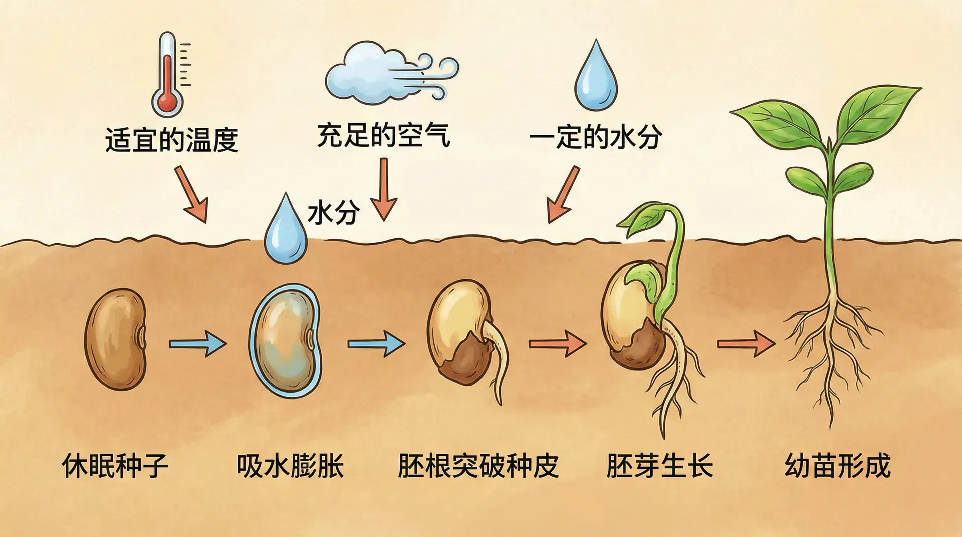 除了自身条件,种子萌发还需要适宜的外界条件,主要包括充足的水分、适宜的温度和充足的空气。