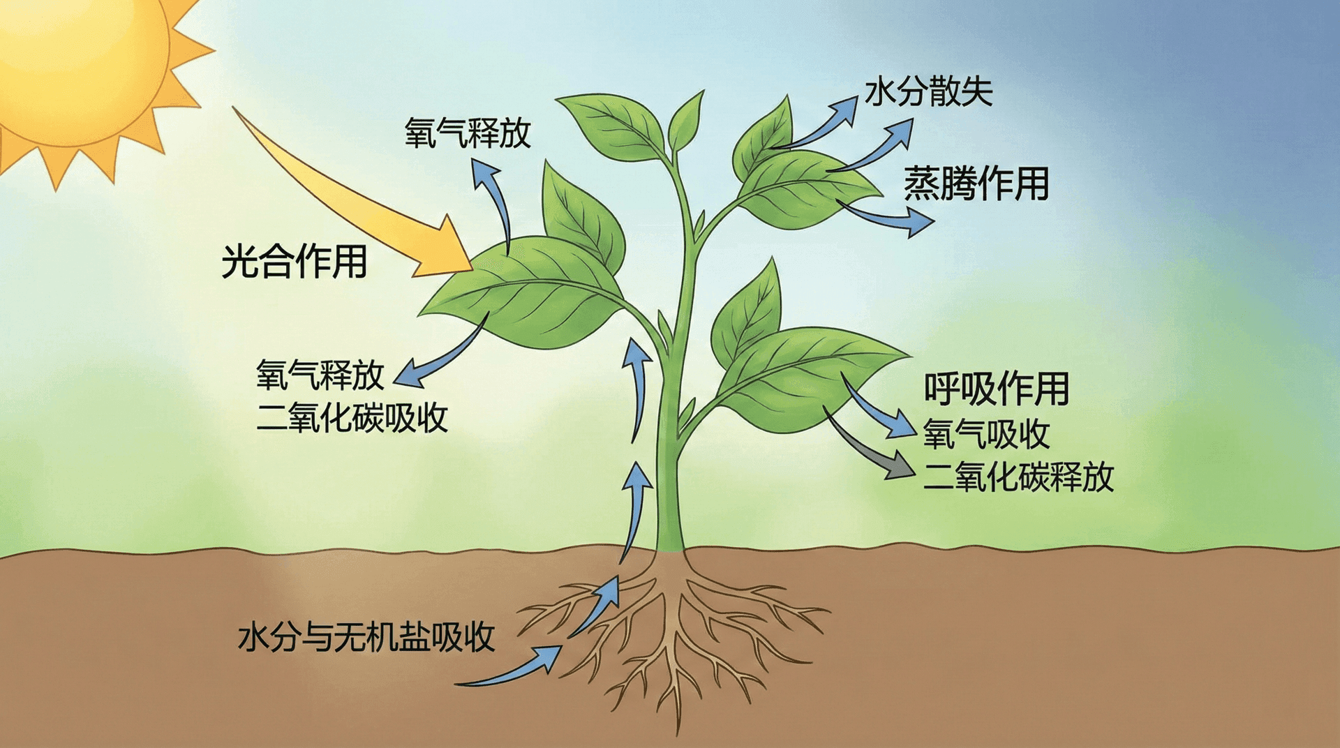 在植物的生长过程中,光合作用和呼吸作用同时进行,但强度有所不同。白天光照充足时,光合作用强度大于呼吸作用,植物合成的有机物多于消耗的有机物,植物表现为吸收二氧化碳、释放氧气,有机物积累,植物生长。夜晚没有光照时,只进行呼吸作用,植物消耗有机物,表现为吸收氧气、释放二氧化碳。