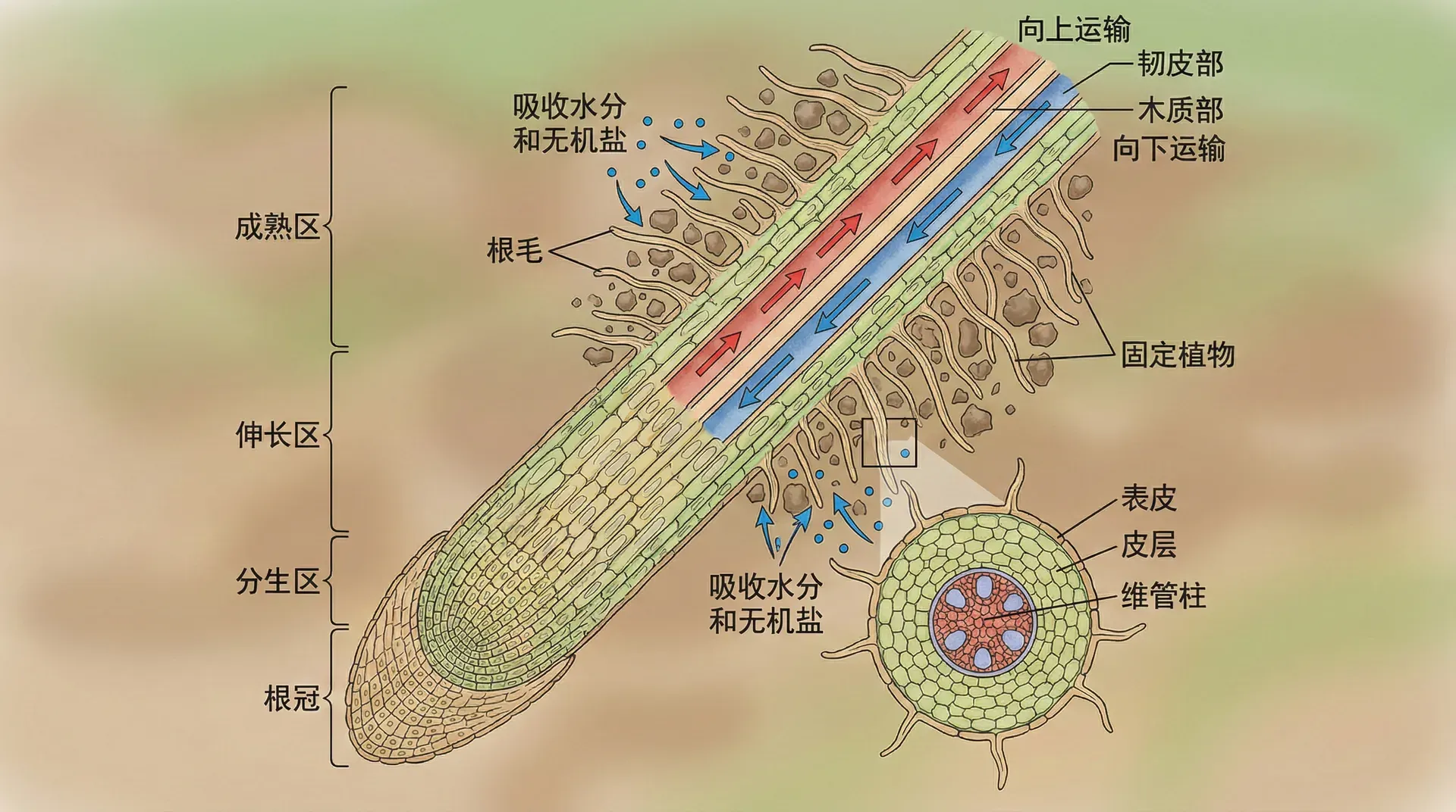 成熟区位于伸长区的上方,这里的细胞已经停止伸长,开始分化成熟。成熟区的重要特征是表皮细胞向外突起,形成大量的根毛。根毛大大增加了根的表面积,提高了吸收水分和无机盐的效率。一株玉米可以有上亿条根毛,如果把所有根毛的表面积加起来,可以达到数百平方米。