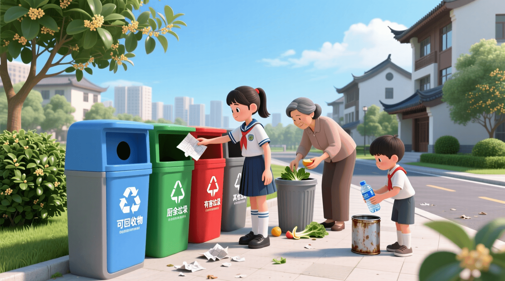 认真进行垃圾分类,将可回收物、厨余垃圾、有害垃圾和其他垃圾分别投放。这样能够提高资源回收利用率,减少环境污染。