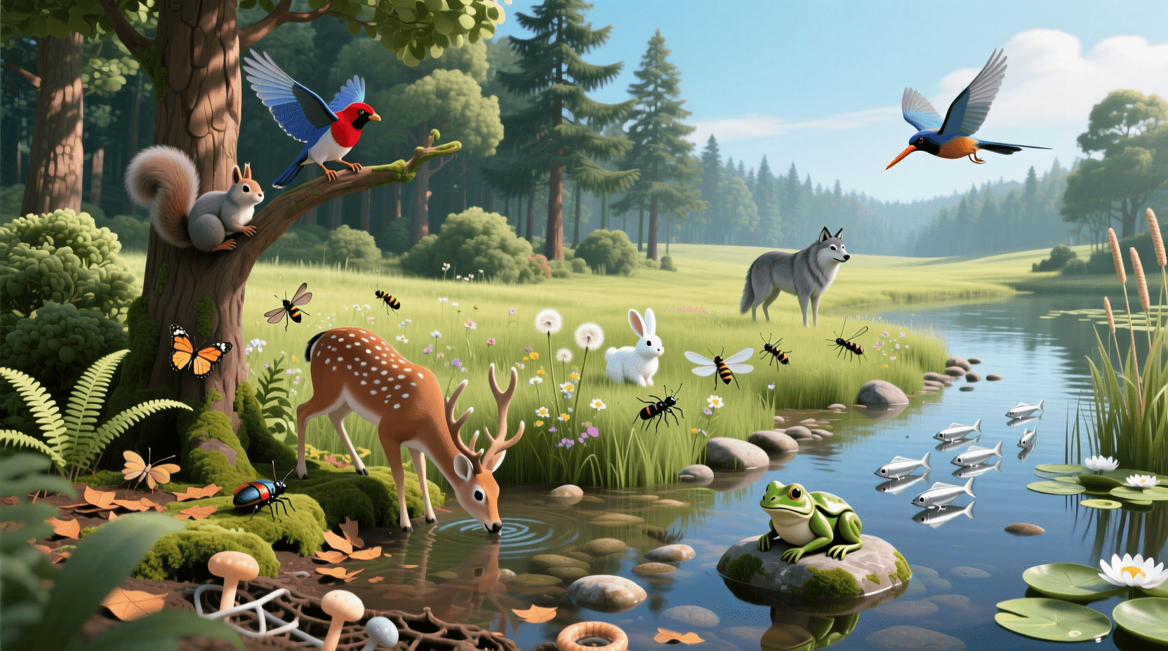 如果你家附近有公园或野外,能看到的动植物就更多了。公园里的池塘中可能有鱼、青蛙、螺蛳。树上可能有啄木鸟在啄虫子。草丛中可能有蚯蚓在松土。晚上,蝙蝠在空中飞行捕捉昆虫。
