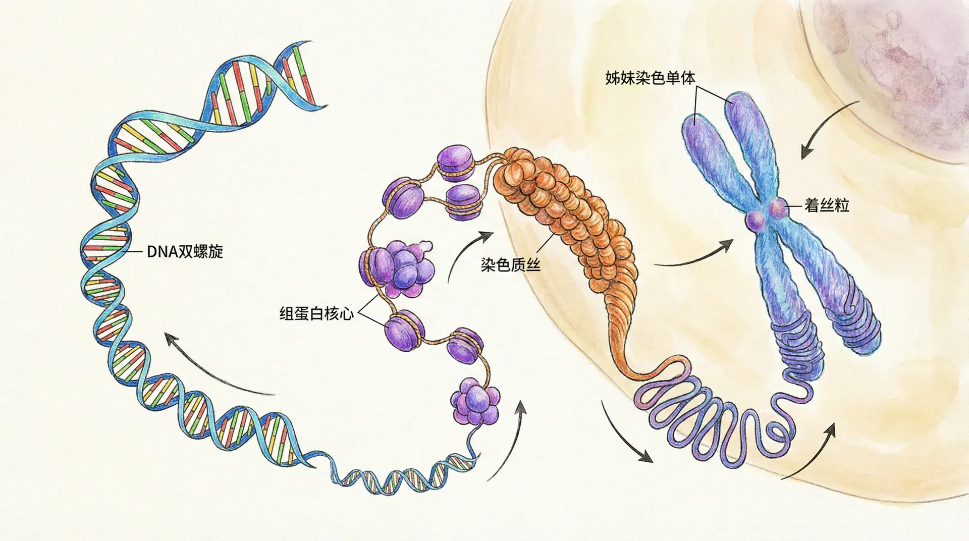 更令人惊奇的是,人类的DNA如果完全拉直展开,长度可达2米,但它却能巧妙地折叠在只有头发丝百分之一那么小的细胞核中。这就像把一根2米长的线塞进一个针眼里,却依然井井有条,随时可以“读取”信息。