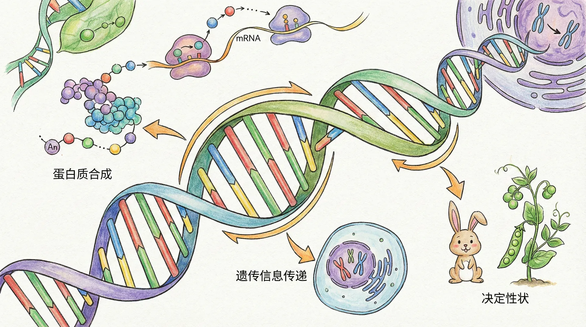 在这本生命的说明书中,并不是每一页都同样重要。科学家把DNA中真正起作用、能控制性状的那些片段叫作基因。如果把DNA比作一本很厚的书,那么基因就是书中最关键的那些章节。