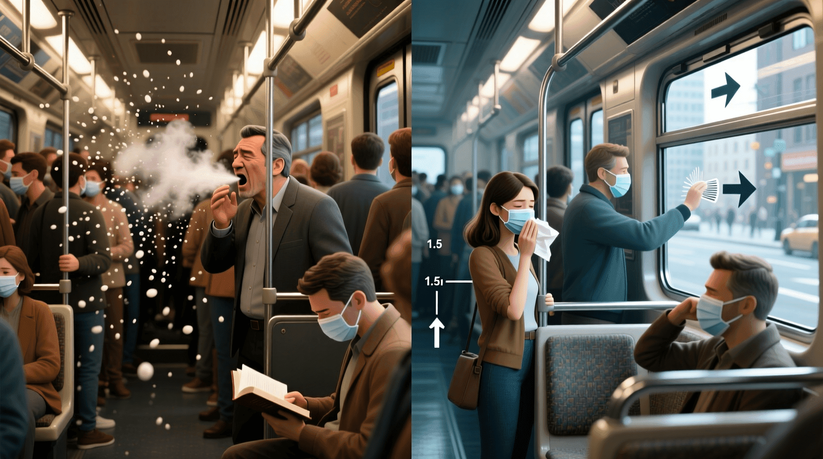 预防空气传播的疾病,要注意开窗通风,保持室内空气流通。在传染病流行期间,少去人多拥挤的公共场所。咳嗽、打喷嚏时用纸巾或手肘遮挡,不要对着别人。如果自己生病了,要主动戴口罩,避免传染给他人。