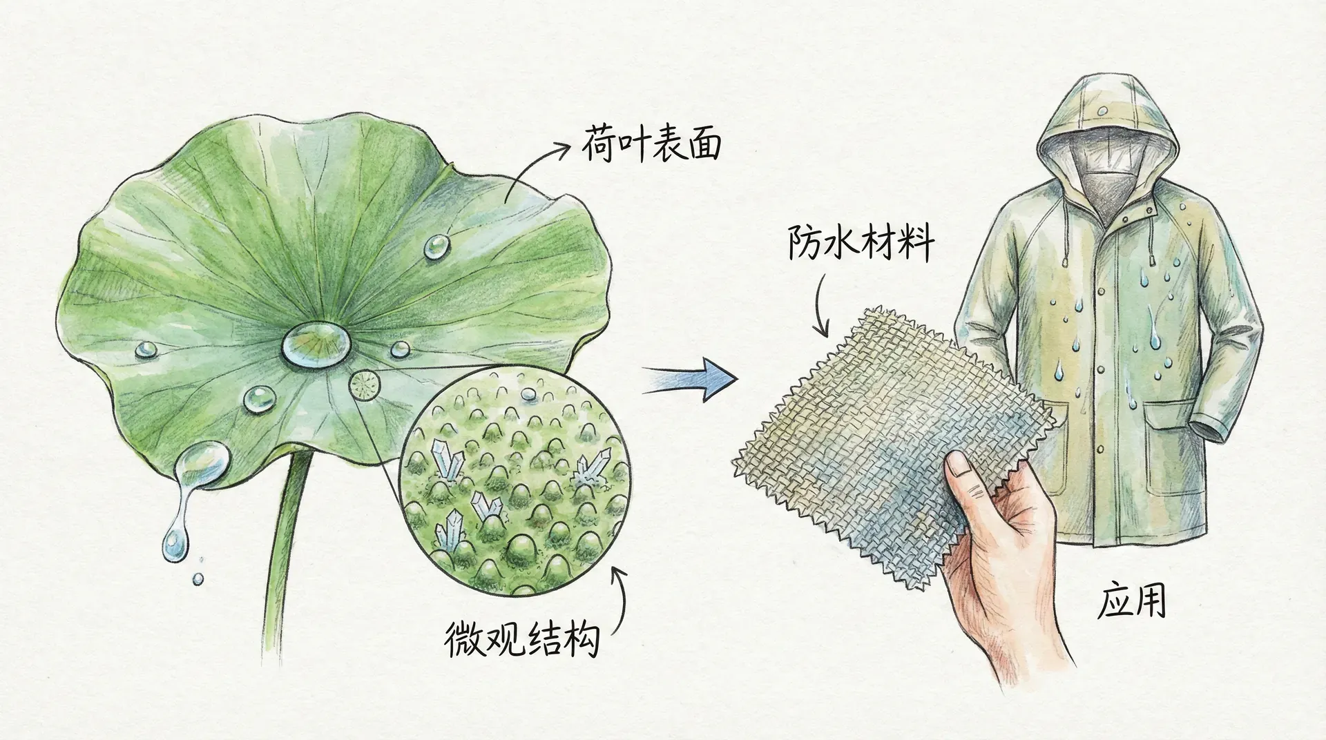 这种现象启发了材料科学的发展。科学家模仿荷叶结构,开发出了表面拥有细微粗糙与特殊涂层的超疏水材料,实现了自清洁、防水效果。