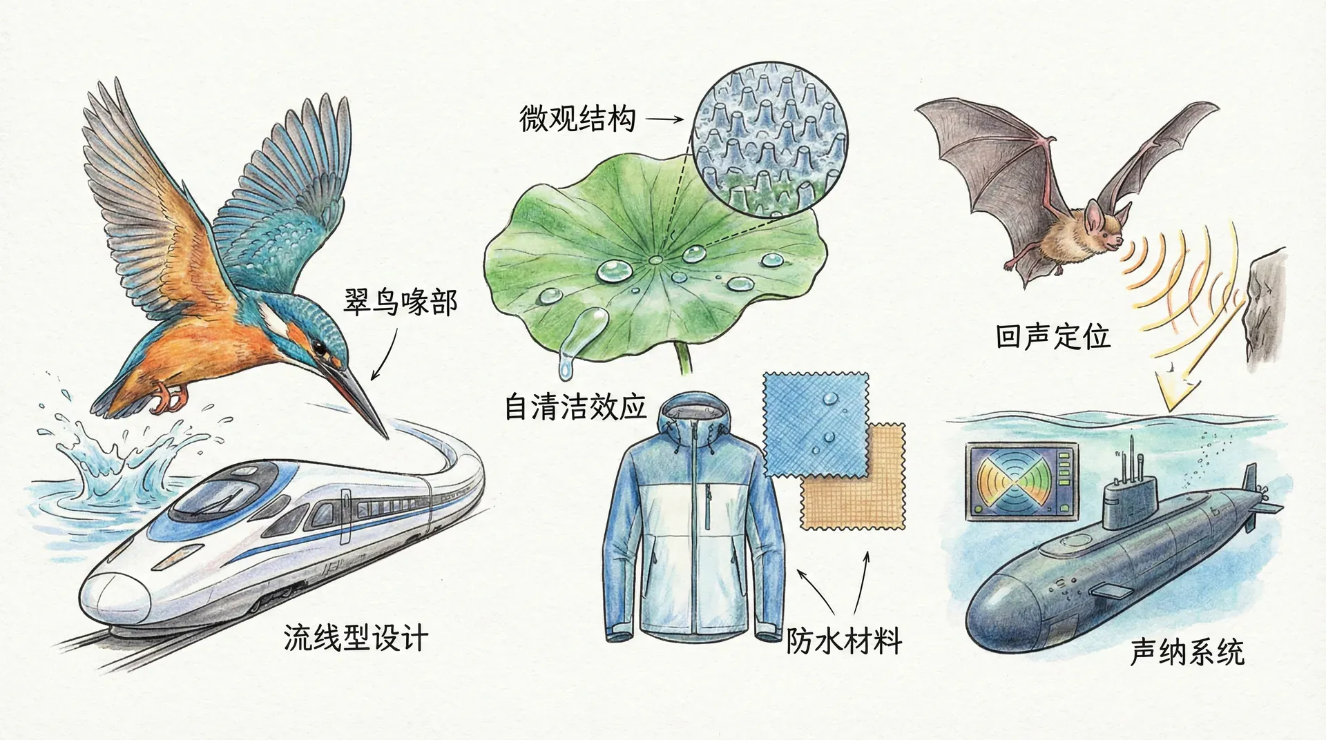 在我们学习了这么多生物知识之后,也许你会发现一个有趣的现象:生物经过漫长的进化,已经发展出了各种各样适应环境的巧妙结构和功能。鸟儿能在空中自由飞翔,蝙蝠在黑暗中准确捕捉猎物,荷叶总能保持清洁,蜘蛛丝细却异常坚韧。这些看似平常的自然现象,其实蕴含着深刻的科学道理。聪明的人类从大自然中获得启发,模仿生物的特殊结构和功能来解决工程技术问题,创造出许多伟大的发明。这种从生物身上学习并应用到技术创新的科学,就叫做仿生学。