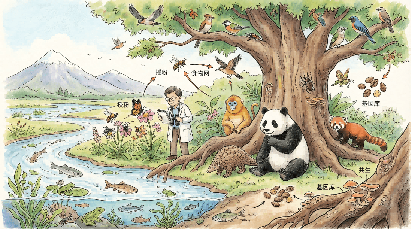 2. 生物多样性是生态系统稳定的基础: 不同物种在生态系统中发挥不同作用,相互依存、相互制约。如果某些物种快速灭绝,可能引发连锁反应,导致整个生态系统崩溃,最终也会影响人类的生存。