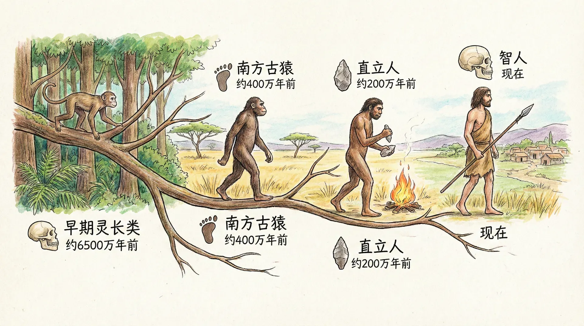 人类和猿类有共同的祖先,这个祖先叫做古猿,生活在距今约1400万年前。后来,由于环境的变化,一部分古猿生活在茂密的森林中,继续在树上生活,它们的后代演化成了今天的各种猿,如黑猩猩、大猩猩、猩猩等。另一部分古猿走出森林,来到开阔的草原上生活,它们的后代经过漫长的演化,最终变成了今天的人类。
