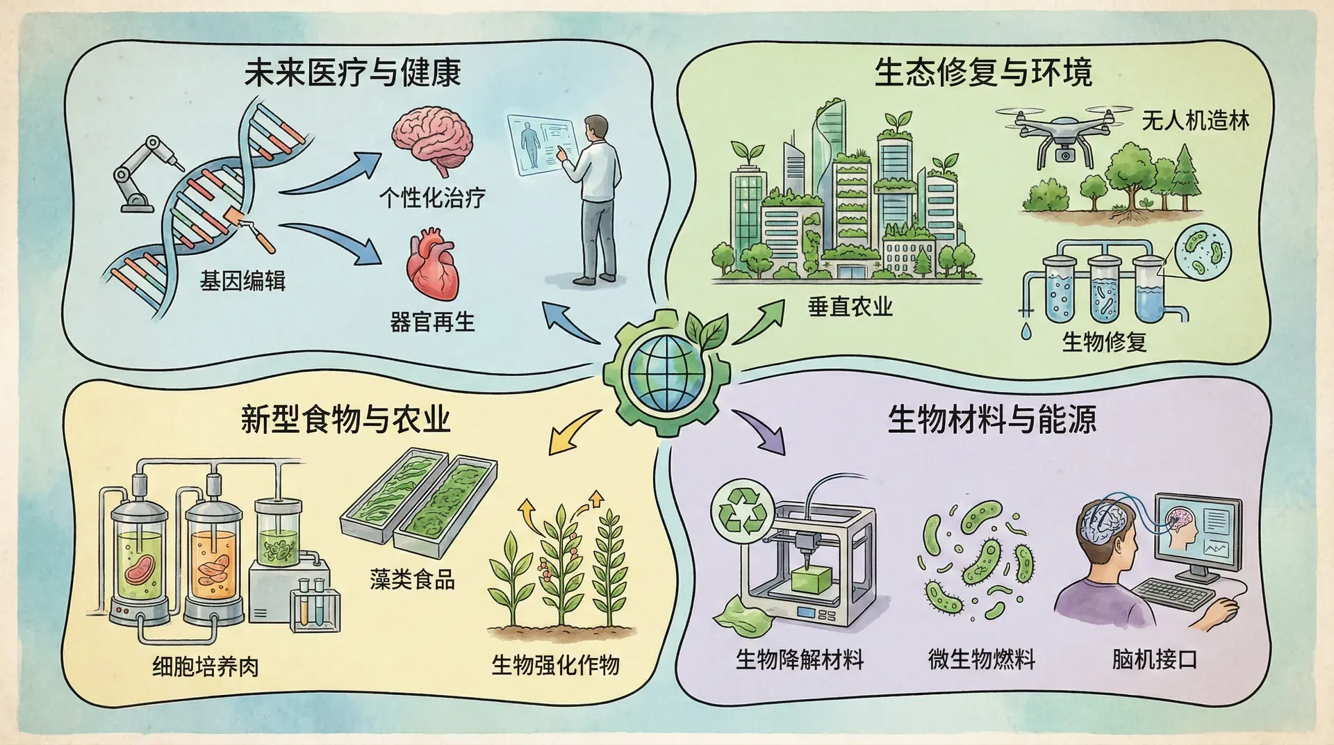 基因编辑、干细胞技术、精准医学、脑科学、合成生物学等前沿技术正在改变我们的世界,为人类带来前所未有的机遇,同时也带来了伦理、安全等方面的挑战。我们必须以负责任的态度对待科技发展,既要积极利用科技造福人类,又要防止科技被滥用。