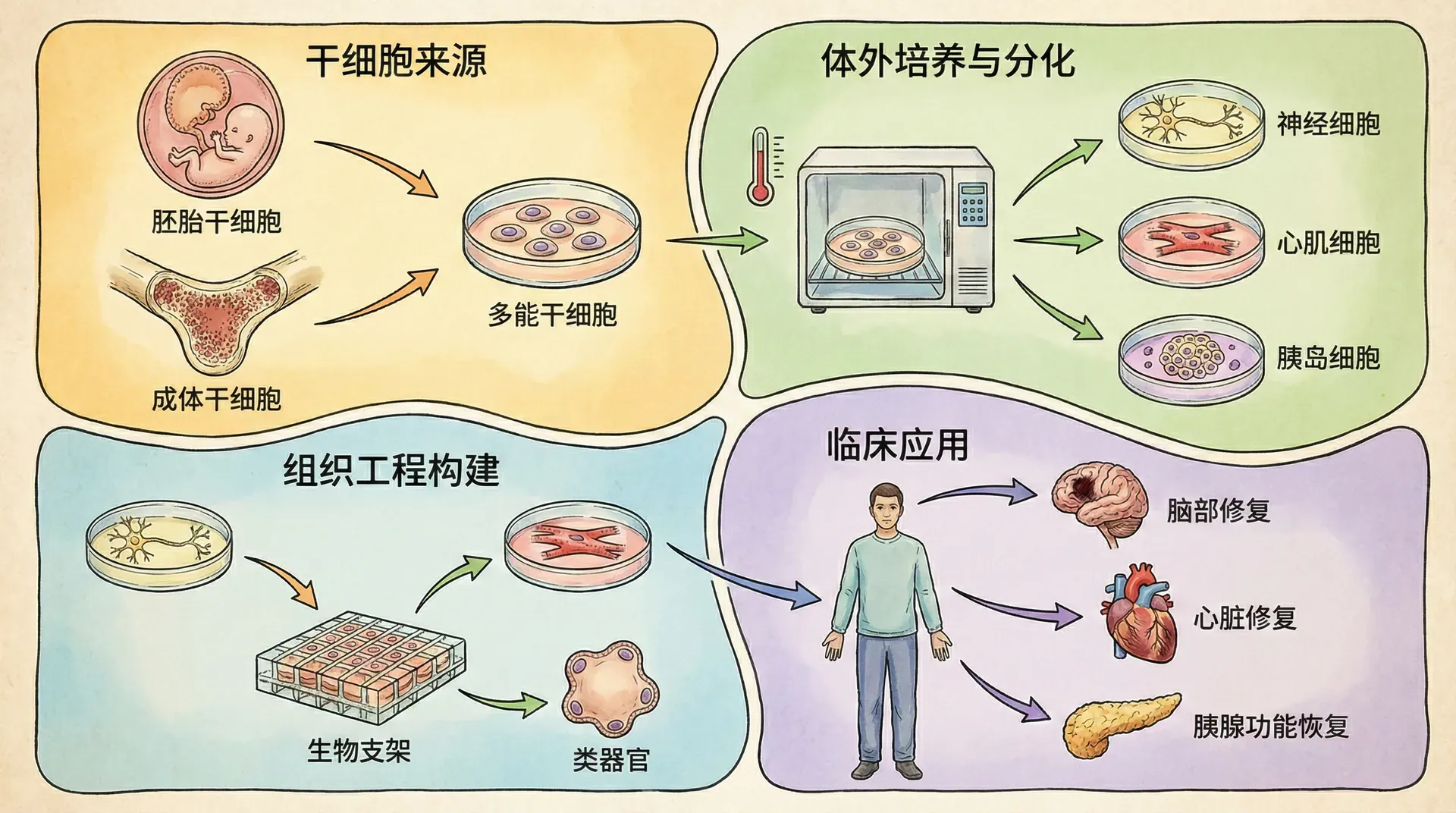 目前干细胞在疾病修复和新型治疗上的应用日益广泛。例如: