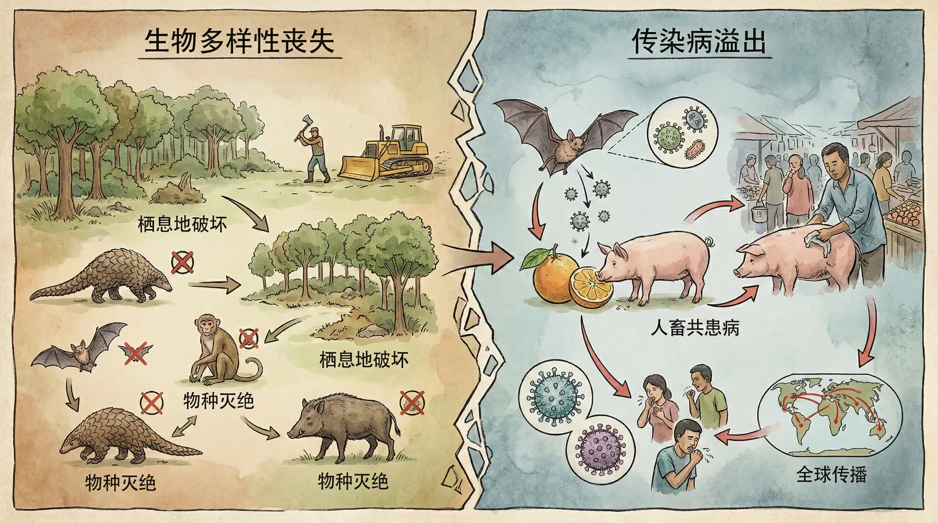 地球上生活着数百万种生物,共同构建了丰富的生物圈。但人类活动导致生物多样性以前所未有的速度丧失,部分科学家甚至认为我们正面临第六次物种大灭绝。 首要原因包括栖息地破坏(如森林砍伐、湿地消失)、过度捕猎、非法贸易以及环境污染和气候变化——这些都直接威胁到动植物的生存。与此同时,新发传染病也频繁出现(如SARS、新冠、H7N9等),与人类拓展活动范围、与野生动物接触增多、全球化流动以及抗生素滥用密切相关。