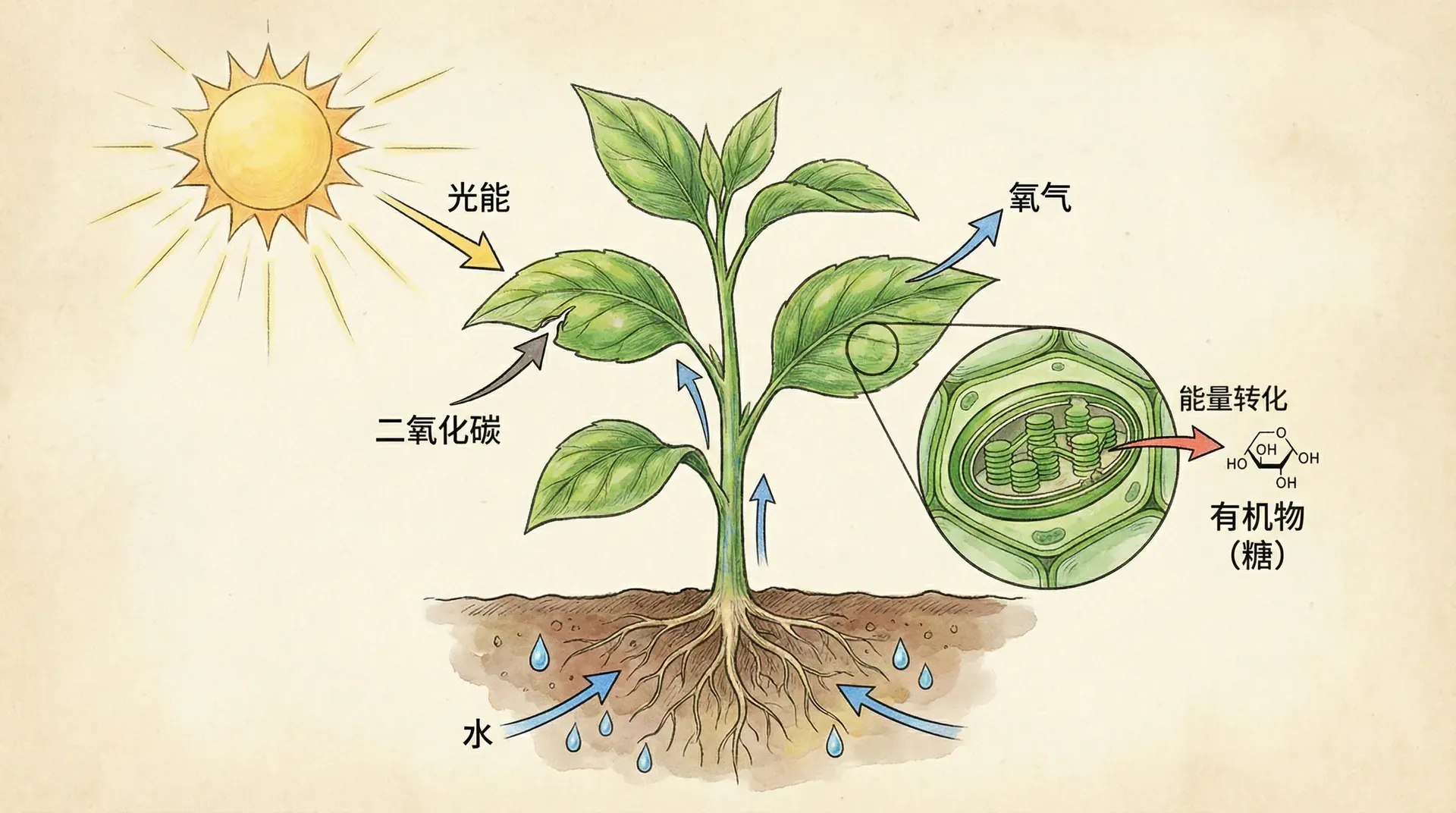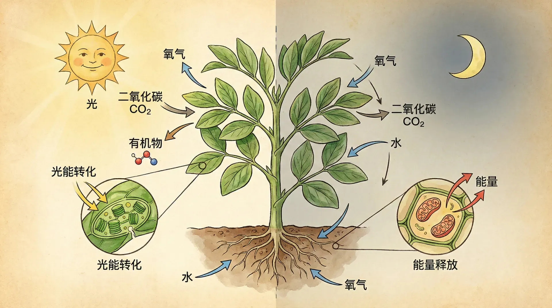 很多同学可能认为,植物只进行光合作用制造养分就够了。其实不然,植物和动物一样,也需要呼吸。呼吸作用是生物体内有机物在细胞内经过一系列的氧化分解,最终生成二氧化碳和水,同时释放能量的过程。这个过程无论白天黑夜都在进行,而且发生在植物的所有活细胞中。