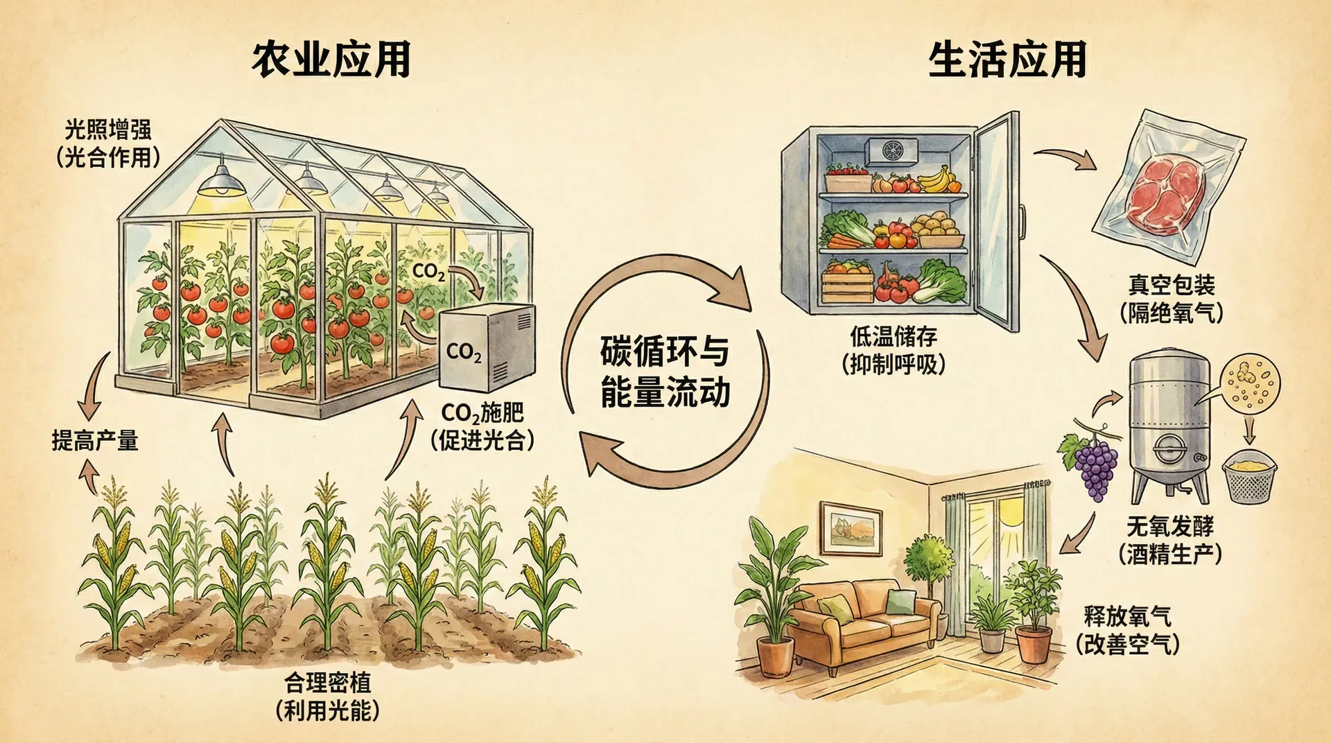 在储存粮食、蔬菜、水果时,要注意降低呼吸作用,减少有机物的消耗。低温可以降低呼吸作用的速率,所以冰箱、冷库是储存食物的重要设施。降低氧气浓度也能抑制呼吸作用,气调贮藏就是利用这个原理,通过调节储藏环境中的气体成分,延长农产品的保鲜期。