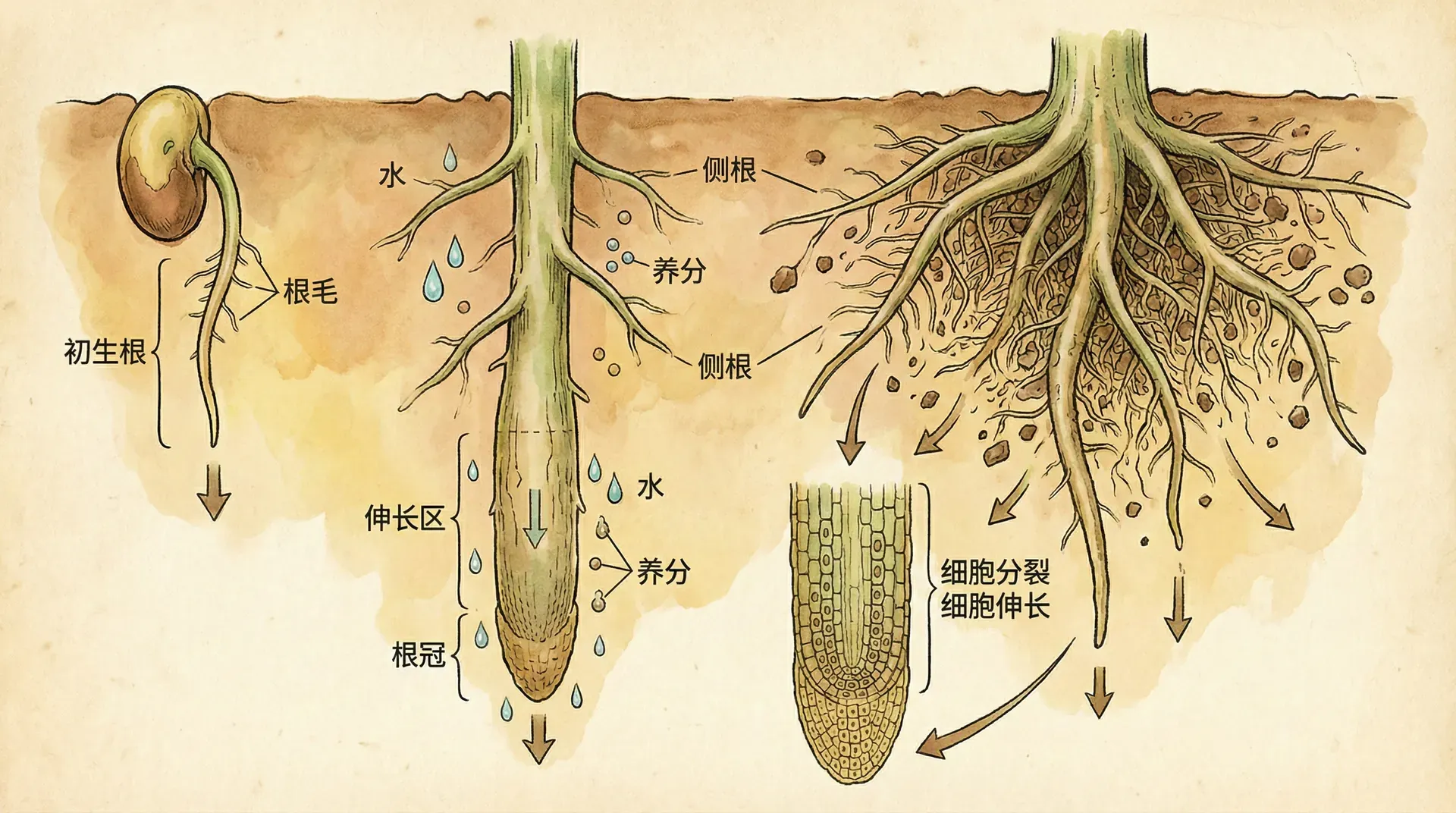 根的生长实际上是细胞分裂和细胞伸长共同作用的结果。分生区的细胞不断分裂,增加细胞的数量;伸长区的细胞迅速伸长,增大细胞的体积。两个过程相互配合,使根能够持续快速地生长。
