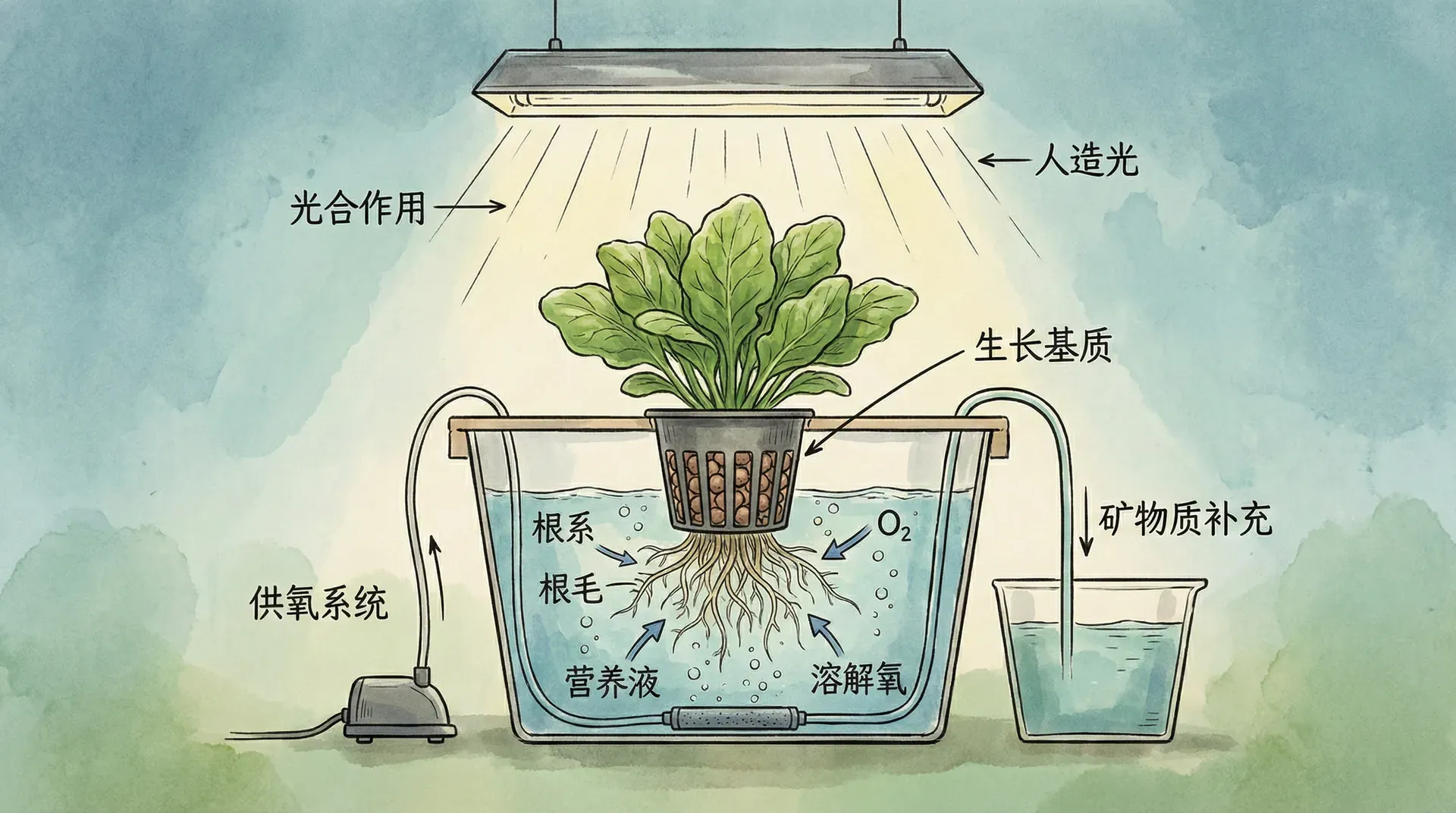 无土栽培是用营养液代替土壤来栽培植物的技术。营养液中按照植物生长需求配制了各种必需的营养元素,包括氮、磷、钾等大量元素和铁、锰、锌等微量元素。植物的根系直接浸泡在营养液中,或者通过基质(如蛭石、珍珠岩等)来固定植物,用营养液进行灌溉。