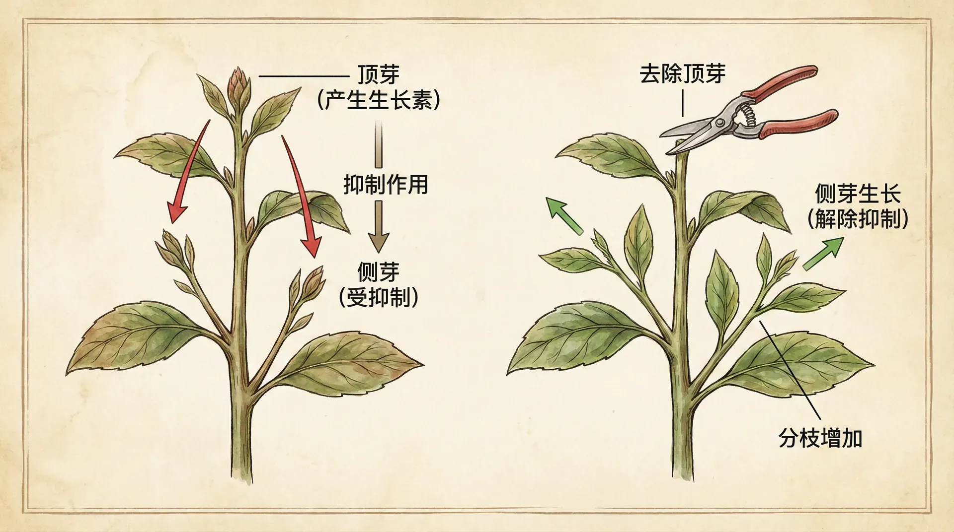 如果我们摘除植物的顶芽,侧芽就会迅速生长。这是因为去掉顶芽后,生长素来源减少,对侧芽的抑制作用解除,侧芽就能快速生长。棉花、茶树、果树等许多农作物的栽培中,农民都利用这个原理进行“摘心”或“打顶”,促进侧枝生长,增加产量。