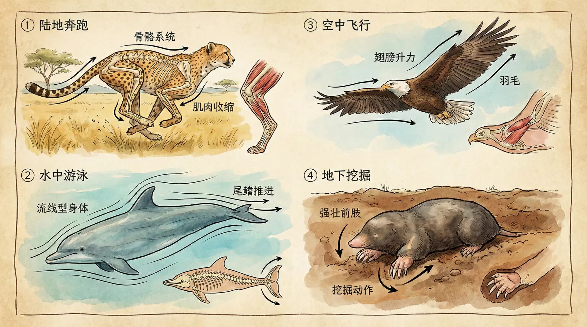 这些不同的运动方式都是动物长期适应环境的结果。生活在草原上的动物需要快速奔跑,所以进化出了强健的四肢;生活在水中的动物需要游泳,所以进化出了流线型的身体;生活在天空的动物需要飞翔,所以进化出了轻盈的骨骼和强大的翅膀。这充分体现了“结构与功能相适应”的生物学原理。