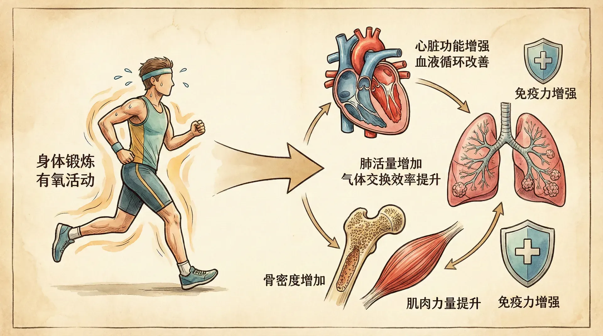运动对健康的好处是多方面的。规律的运动能够增强骨骼密度,预防骨质疏松;能够增强肌肉力量和耐力,提高身体素质;能够改善心肺功能,增强体质;还能够促进血液循环,加快新陈代谢。此外,运动还能调节情绪,缓解压力,使人心情愉悦。